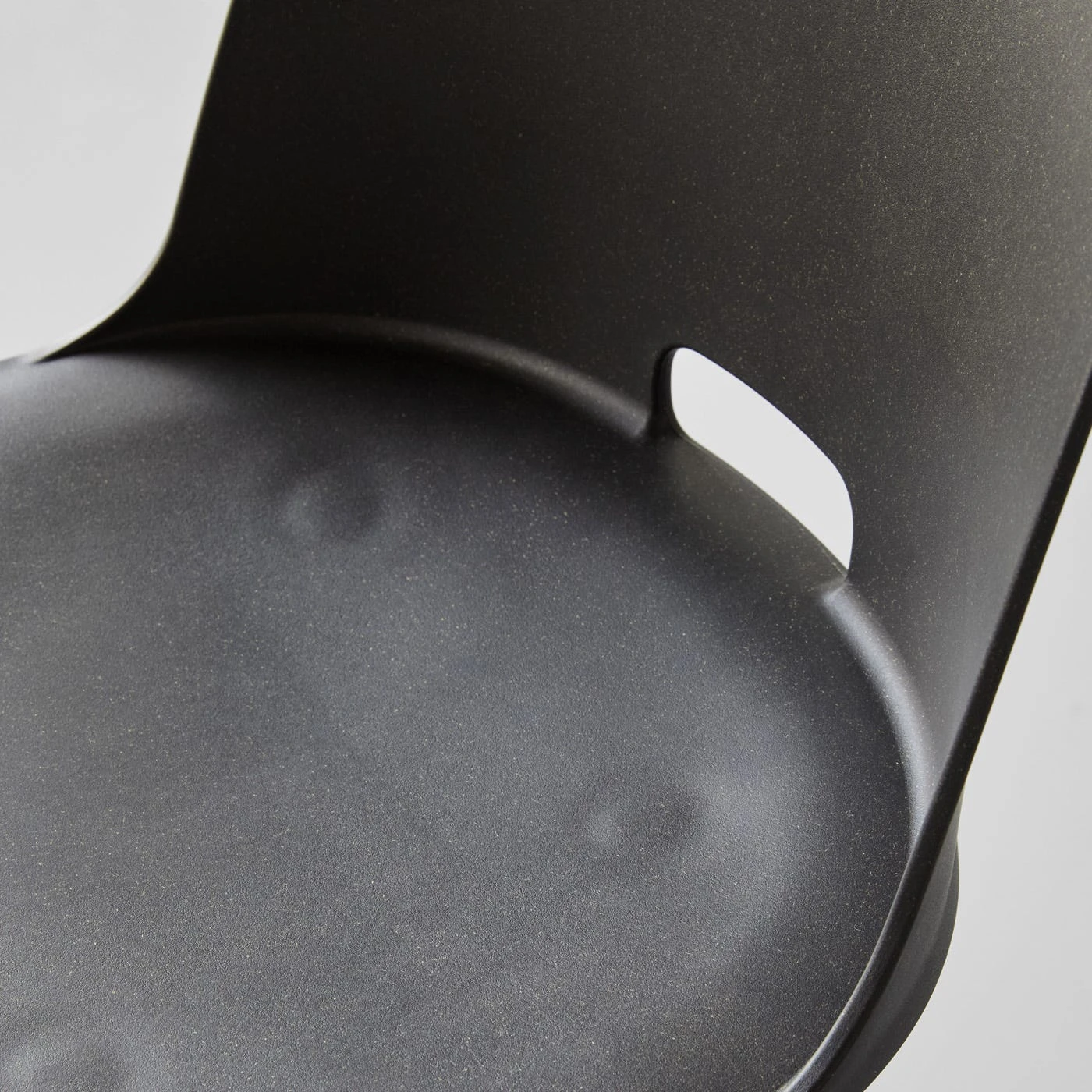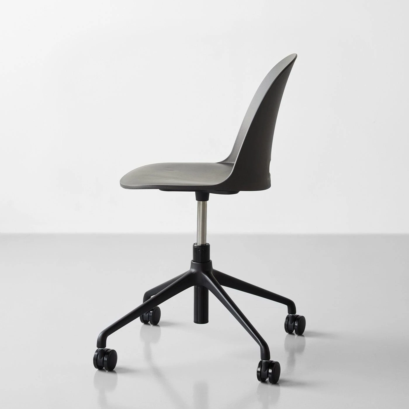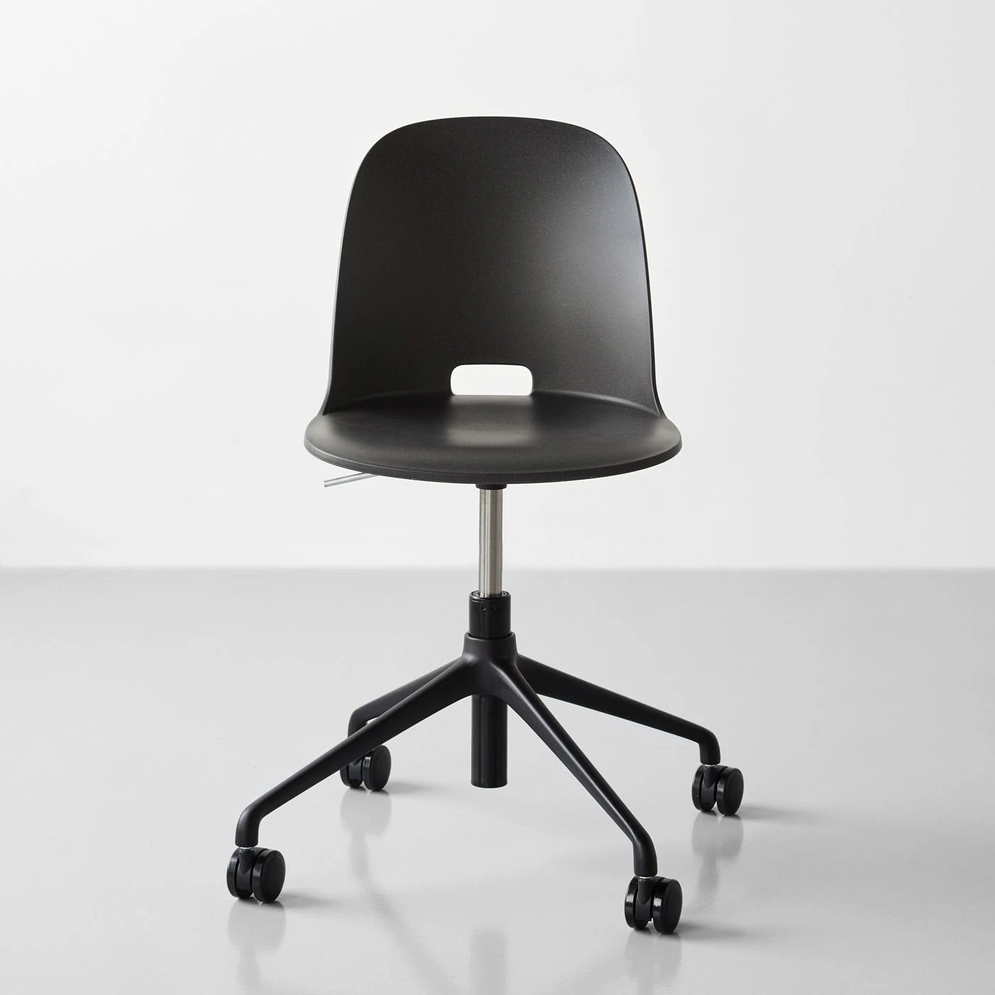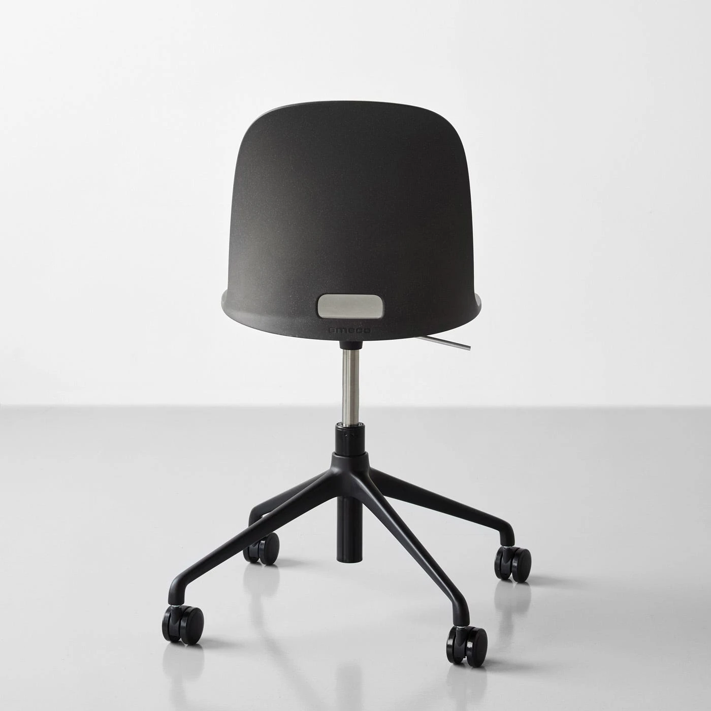 Meticulously designed by Jasper Morrison for Emeco, the Alfi Dark Gray Reclaimed Work Chair perfectly captures Morrison’s simple and purposeful aesthetic. Each feature is optimized for productivity and comfort, including the high-back seat on a durable swivel base, gas shock seat suspension, adjustable seat height and smooth-rolling multi-surface casters—all while maintaining a thin, sleek silhouette. The seat is crafted from recycled and reclaimed wood-filled polypropylene, transforming cut-offs and waste into a smooth, gently curved surface. This desk chair’s deep gray tone features a lightly speckled appearance created by compressed wood particles during the production process.