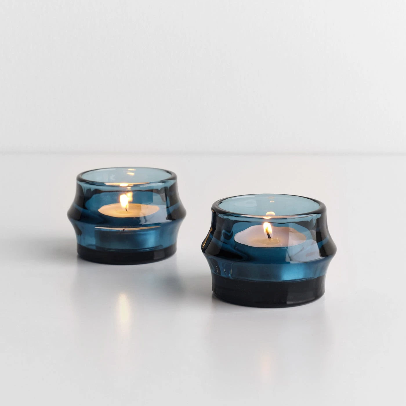 Designed by Sebastian Holmbäck, a Danish industrial designer, Arc Blue Tealight Holders add a serene touch to a tabletop, mantel or shelf. These vessels are created with Holmegaard’s unsurpassed glass craftsmanship, resulting in a smooth, elegant shape. The stout silhouette is balanced by a center axis, with curved arcs extending toward the top and bottom. Tealight candles easily nestle inside, and the soft blue tint enhances the peaceful, relaxing effect of flickering candlelight. These tealight holders coordinate with other pieces from the Arc Glass Vase Collection.