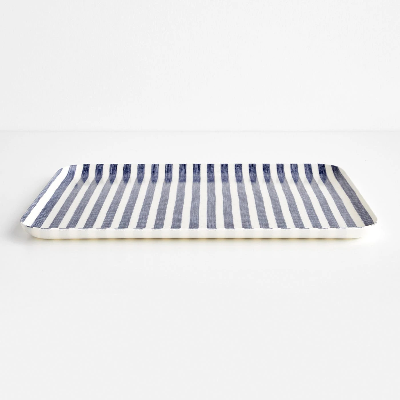 The Bengal Blue Stripe Linen Coated Tray is made in Japan by coating linen fabric with polyester resin. The symmetrical blue and white striped pattern serves as a classic, crisp accent for decorating and entertaining alike. Lightweight yet sturdy, this striped tray features softly rounded corners and a slight lip to keep items in place. The large tray size is perfect for serving drinks to guests or transporting snacks to the family room. The smooth surface can also function as a place to collect keys, wallets, mail and other odds and ends near an entryway.