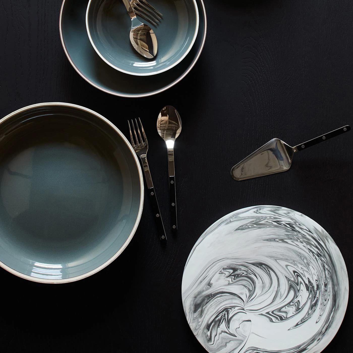 Your favorite dish deserves experience only the finest French cutlery artisans can provide. Part of the Bistro Flatware collection, this black two-piece serving set graces your plates with a stunning blend of stainless steel and black acrylic. Whether they’re used as salad servers or utensils for appetizers, each set is handmade to elevate your culinary experiences one bite at a time. Strong yet elegant, they’re dishwasher safe at low temperatures but made to tolerate high praise. Match them with our Bistro Flatware collections.