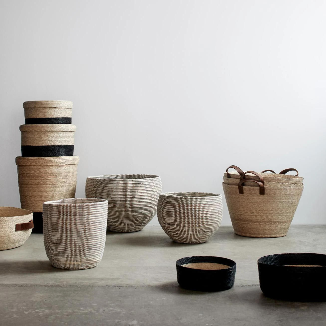 - Hand-braided natural and dyed palm leaves.