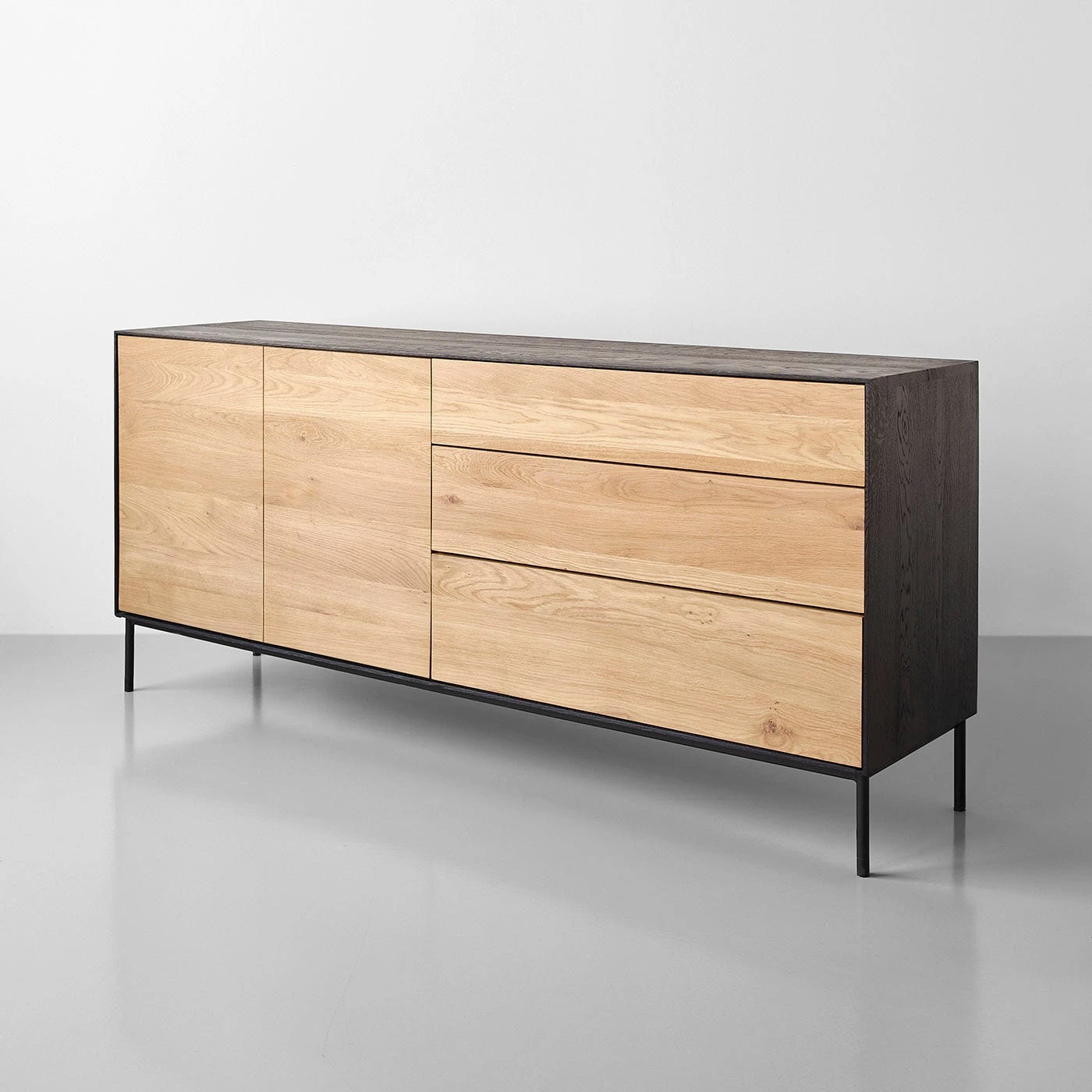 Minimally designed and expertly crafted, the Blackbird Sideboard fits into any interior. The naturally finished solid white oak cabinet doors and drawers are encased by a stained black exterior. A push-open system eliminates the need for handles, and allows for a clean and sleek, uninterrupted surface. Finished with slender, rounded steel legs, this console is a contemporary piece that will endure the test of time while providing ample storage in any room of the house.