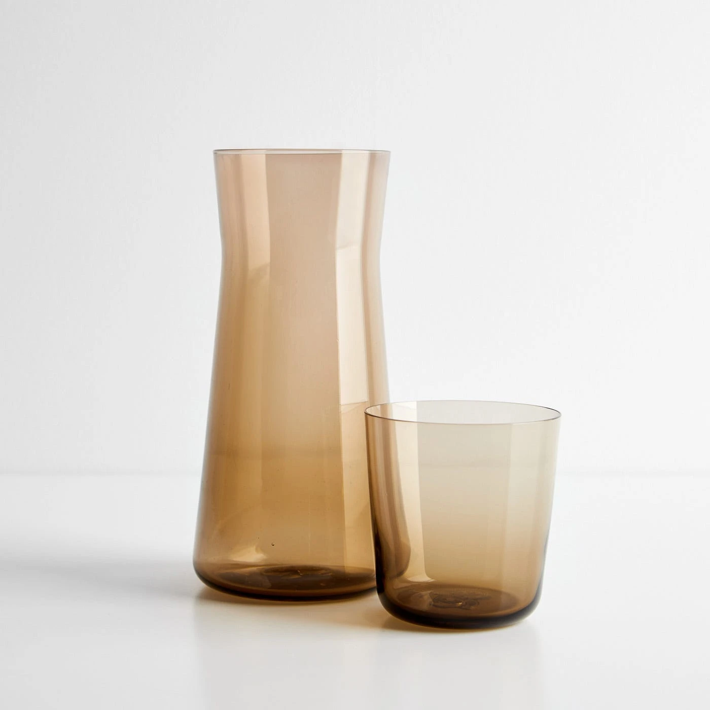 The Bodker Wheat Short Carafe is crafted by artisans in Portland, Oregon using traditional handblown glass techniques. Its minimalist shape is easy to hold and pour, and the earthy, soft brown glass features a subtle ombre effect. The sculptural silhouette is clean, elegant and timelessly modern. Both beautiful and versatile, the carafe can be an attractive pitcher for water, juice and cocktails or a lovely vase. The handblown glass shape also nests together with Bodker’s Classic Short Tumbler for convenient tabletop or bedside service.