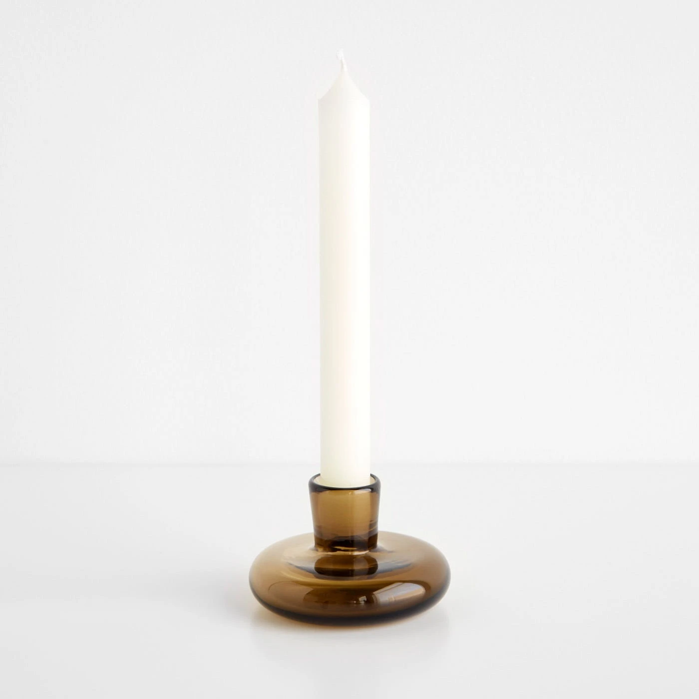 Cast a warm glow in any room with this beautifully crafted glass taper candleholder in a soft, wheat brown hue. Each one is handmade in Portland, Oregon by Gary Bodker Designs, resulting in one-of-a-kind pieces with distinctive, organic shapes. The simple design looks refined on a tabletop or mantel, with the disc base designed to conveniently catch wax drips. Mix and match from the range of rich, vibrant tones for an eclectic display or collect one color for a cohesive, restrained look. Create a custom set to gift for a housewarming, wedding or other milestone event.
