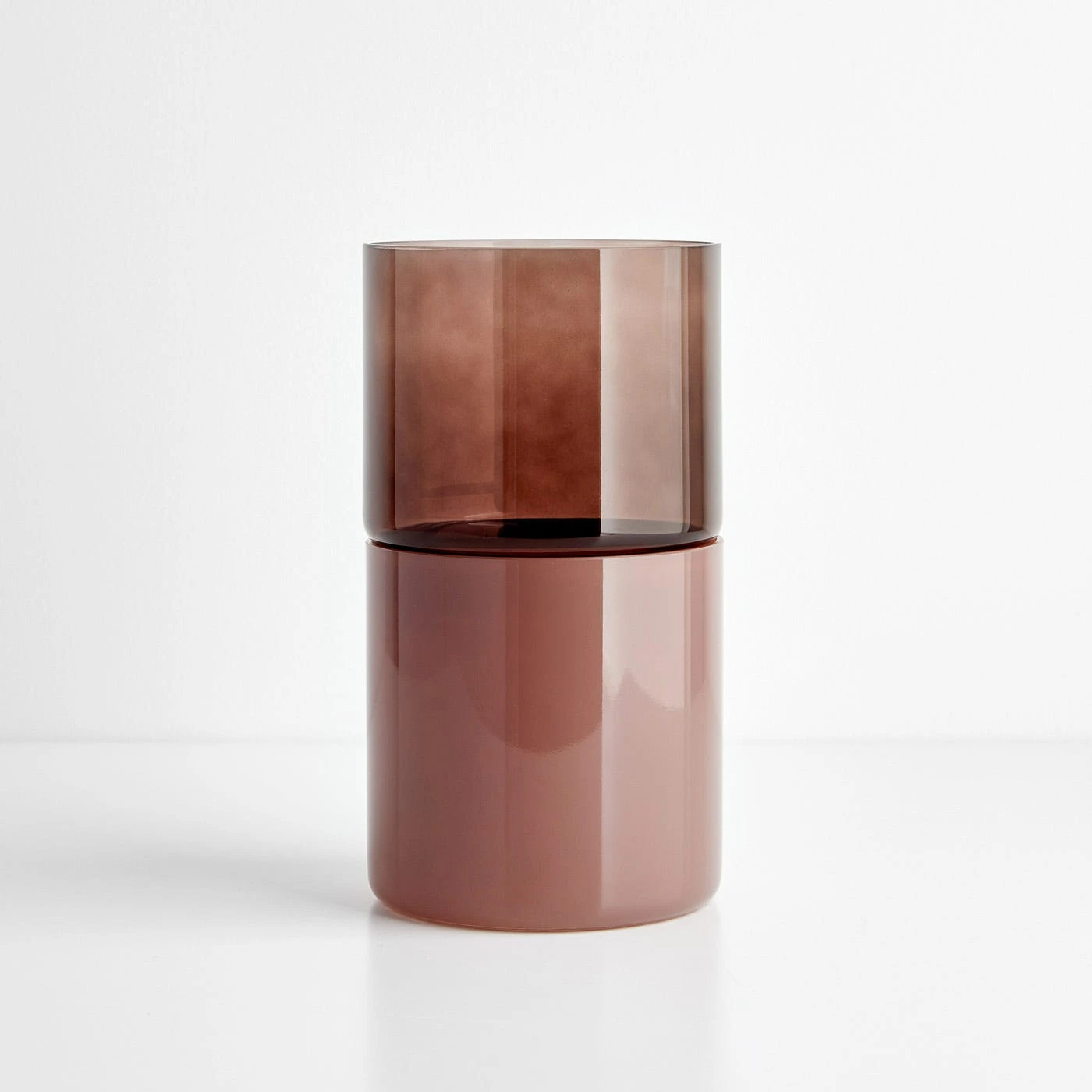 The Broste Copenhagen Georg Dark Rose Glass Vase features a distinctive, two-part design. With its complementary transparent and opaque finishes and a sculptural silhouette, this light mauve vase provides an equal level of visual interest as the blooms or greenery it holds. Its versatile shape also allows the vase to serve as an attractive decorative accent even when empty. The handblown glass form features a classic cylinder base with a matching top that beautifully displays classic bouquets and solitary stems. The upper portion is removable, allowing for smaller flower displays.