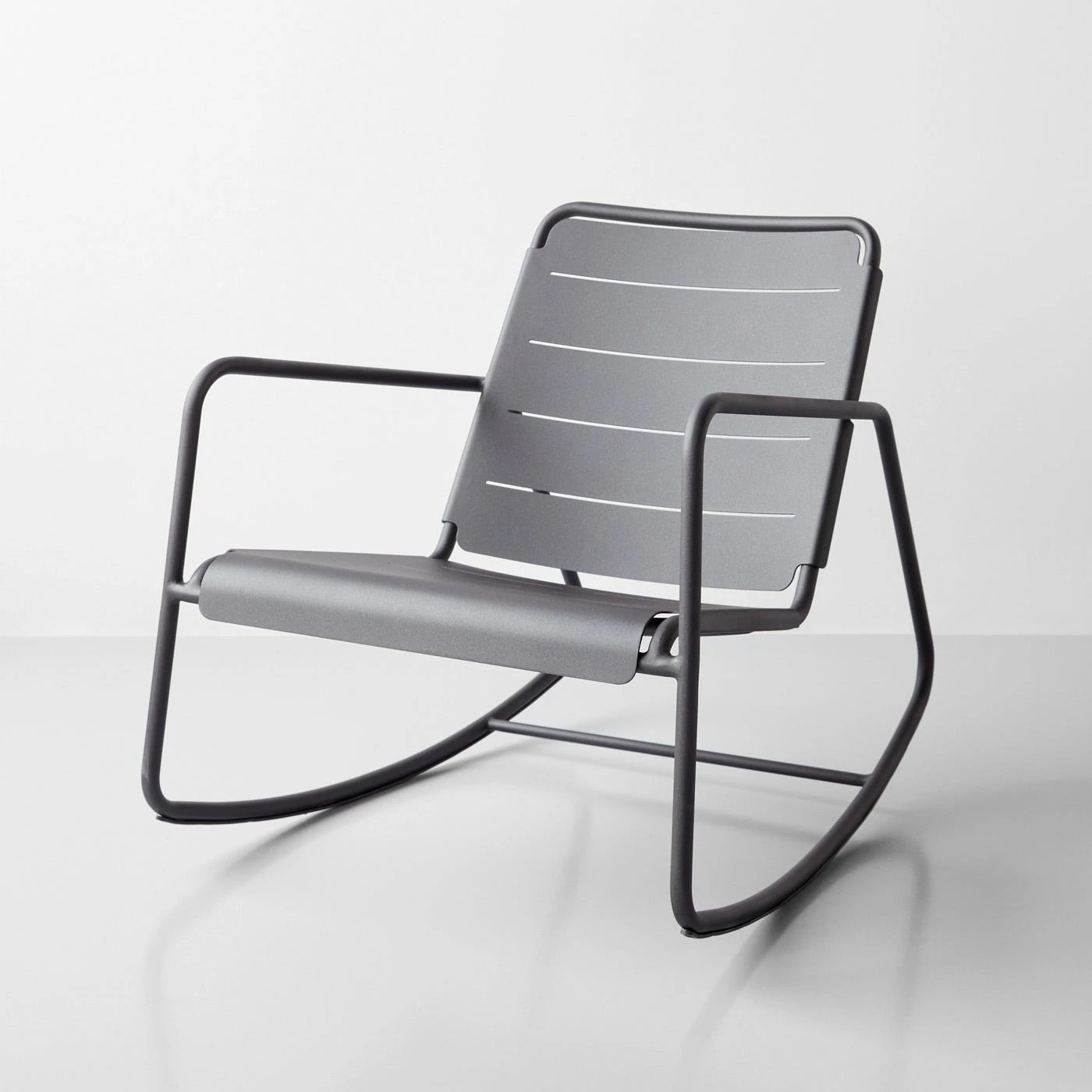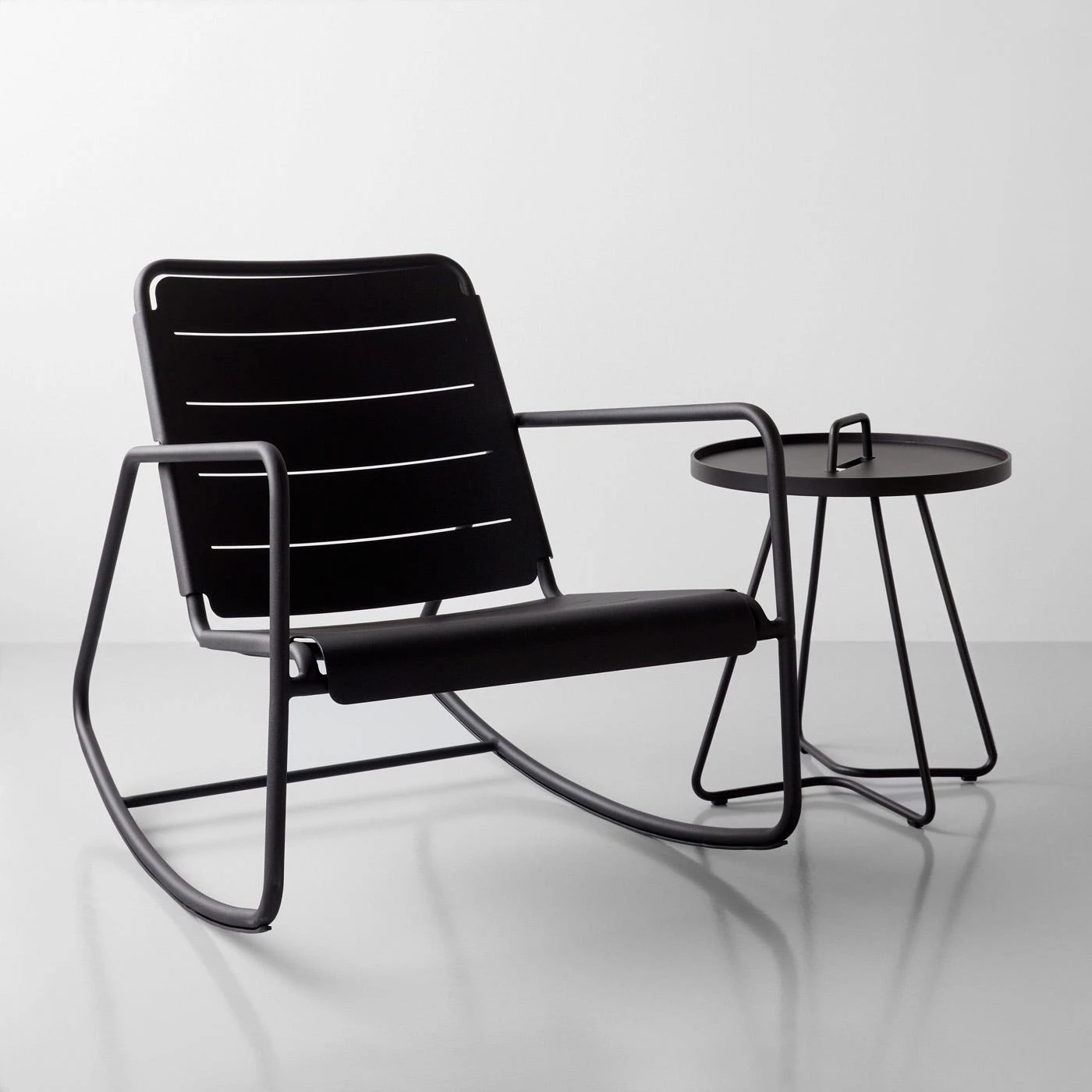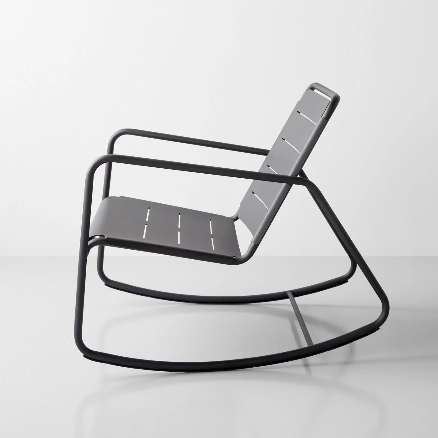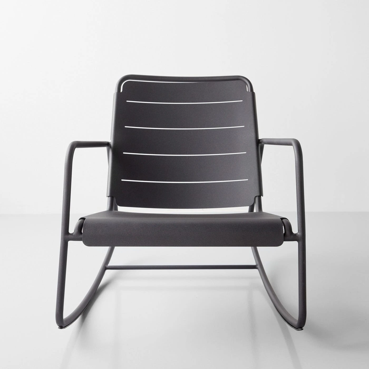 With a generously sized seat, gently curved back and comfortable arms, the Copenhagen Lava Gray Rocking Chair invites you to lounge and unwind. The subtly textured surface features a slight sheen and a powder-coated finish for flexible indoor/outdoor use. Made with a substantial gauge of aluminum, it’s particularly durable and surprisingly light, making it easy to pick up and move as needed. Featuring laser-cut slots for efficient drainage, this contemporary update to the classic rocking chair turns a sunroom, patio or porch into your own relaxing retreat. Plastic guards on the runners ensure a smooth rocking motion while protecting surfaces underneath.