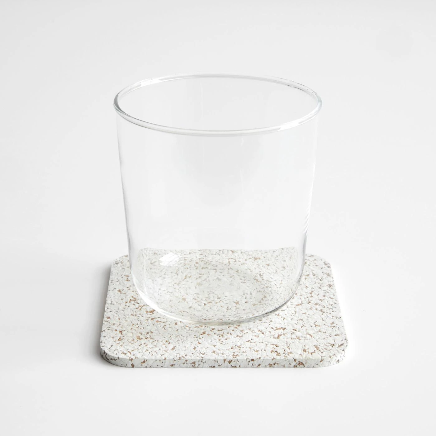 Made by fusing soft rubber and natural cork, these versatile coasters are the perfect protection against beverages hot or cold. Their manufacturing method is innovative, involving just heat and pressure, and excluding any binders or harmful chemicals. In clean white, with speckles of a sandy hue, they inspire a relaxing mood.