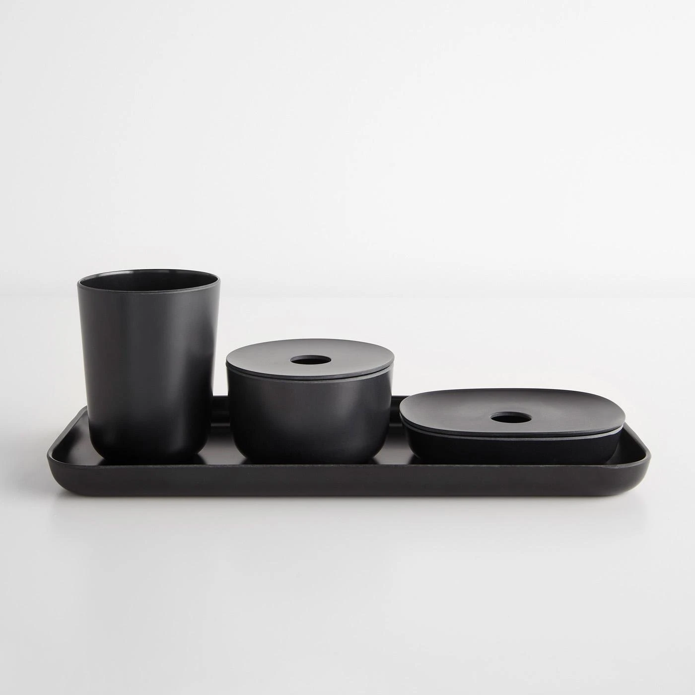 This little tray has tons of uses and will feel at home in any room. Place it on your bedside table to corral your nighttime items, use it in the bathroom to contain your toothbrush holder and soap pump, or stow it near your entry to catch your keys when you walk in the door. It’s safe for food use too — made from organic bamboo fiber and melamine — this tray is durable, lightweight, and dishwasher safe. After dinner use this matte black tray to display your most decadent desserts with sophistication. This simple tray coordinates with other items in the Ekobo bathroom collection but also looks great on its own.