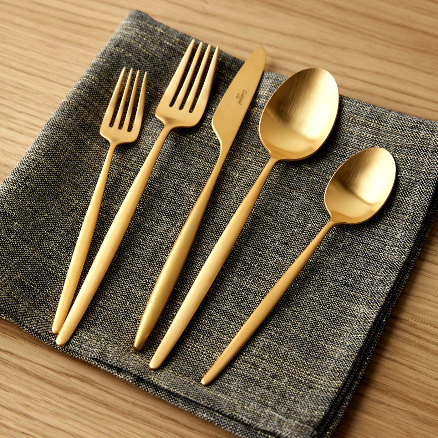 A graceful and timeless flatware set that feels good in your hand. Made in Portugal and finished in an eye-catching 24-carat brushed gold, striking curves pair with a thin silhouette for a look as dramatic as it is versatile. Not just for formal occasions, this easy to clean flatware set can also be used for everyday dinners and impromptu entertaining.