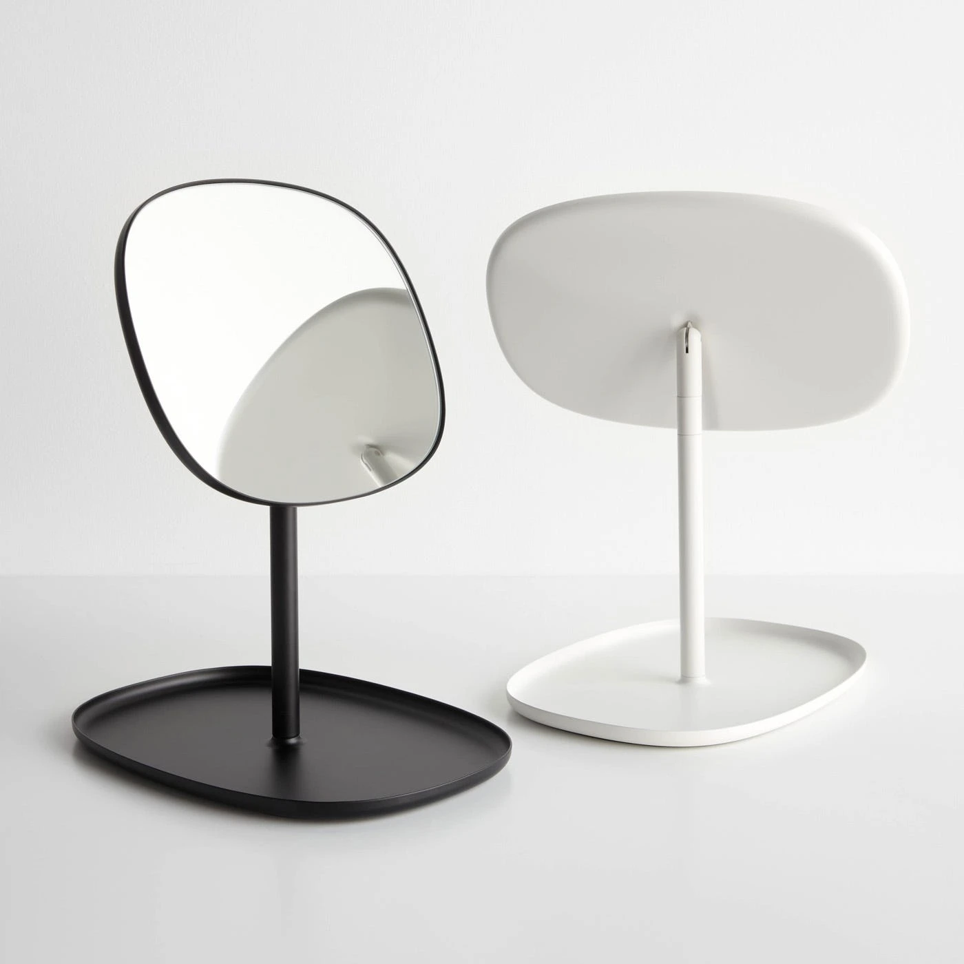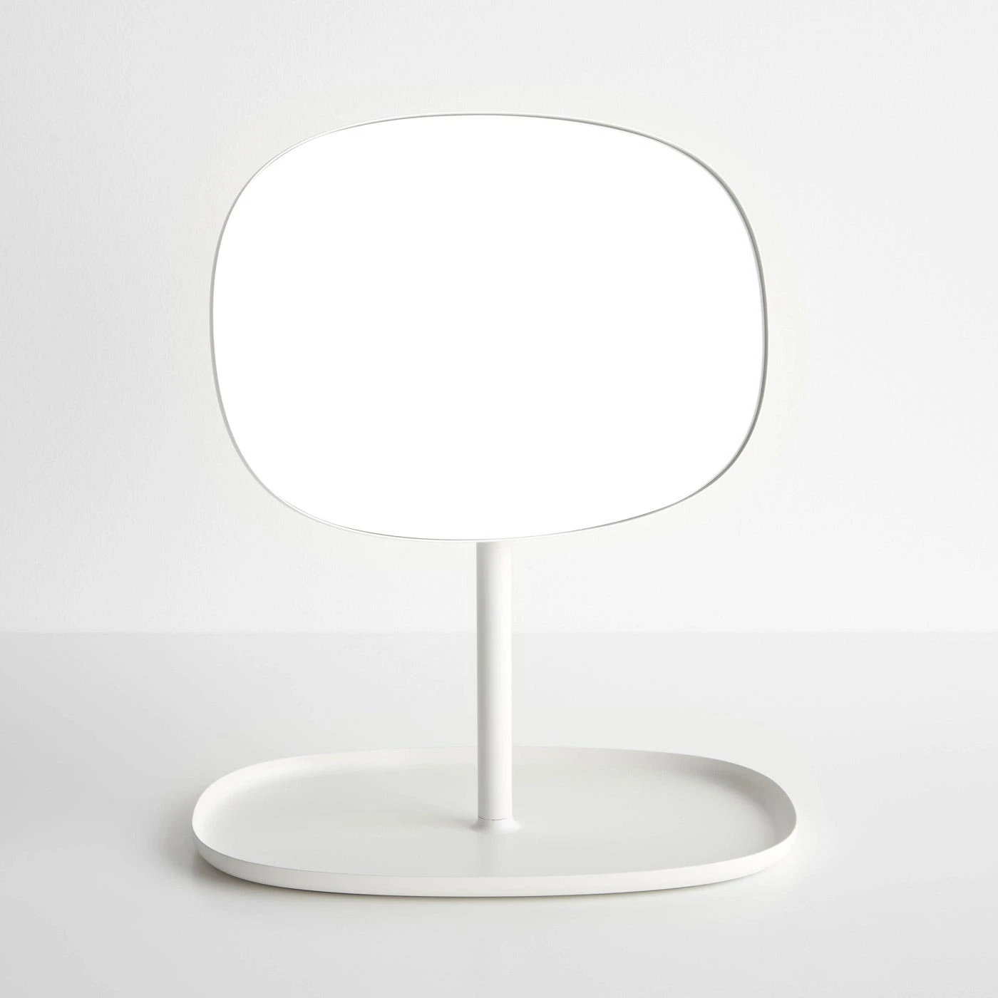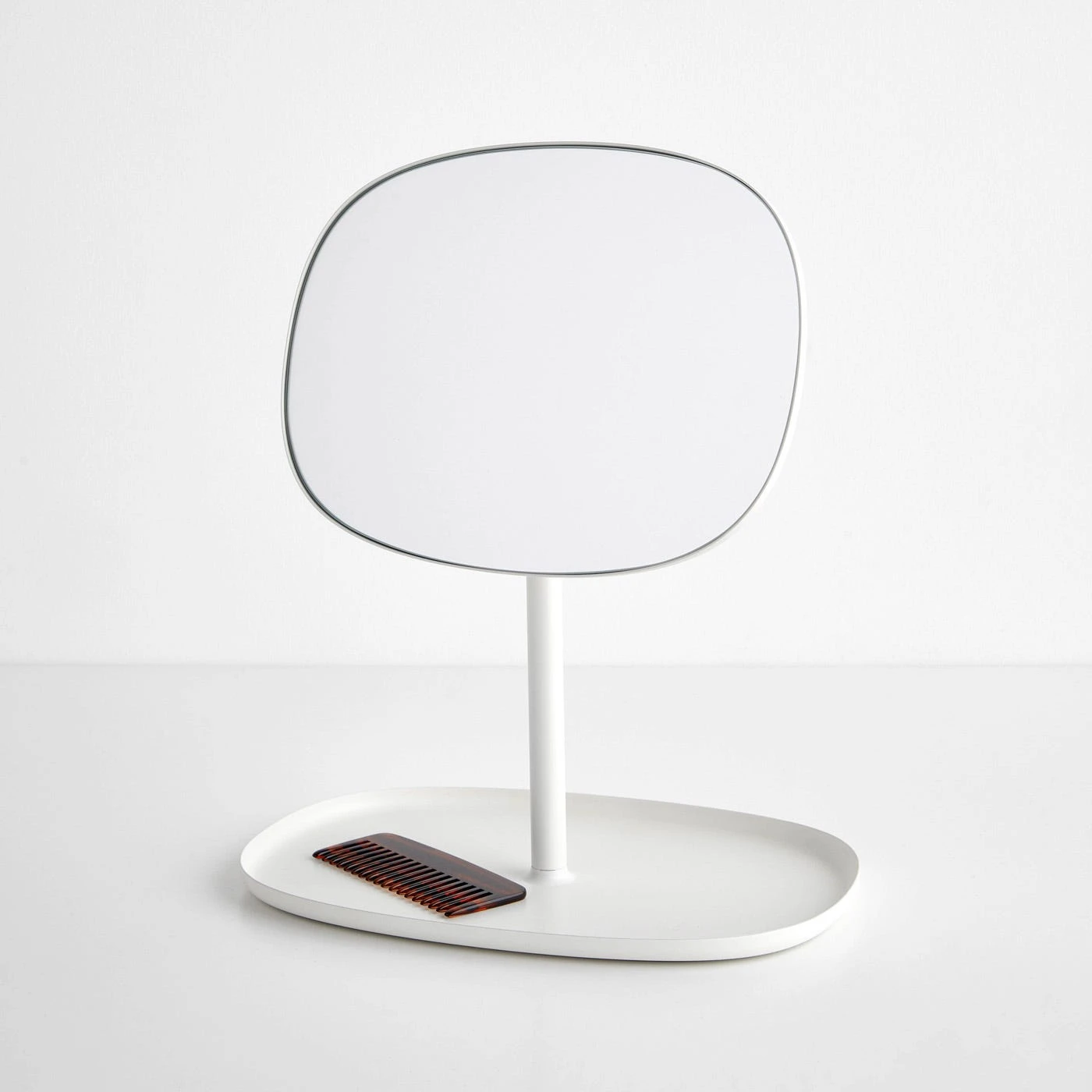 The Flip Mirror’s attractive and functional design makes it an endlessly versatile accessory for the home. An adjustable head allows you to achieve the ideal angle for viewing. Perfect for placing on bathroom countertops, bedroom dressers or entryway tables, the mirror is paired with a simple tray that serves as a balanced base and a convenient spot to store jewelry, keys, coins and other small items. Organic forms add a softness to this mirror made from sturdy steel and glass. A powder-coated finish in a crisp white tone gives this charming piece an airy, minimalist appearance.