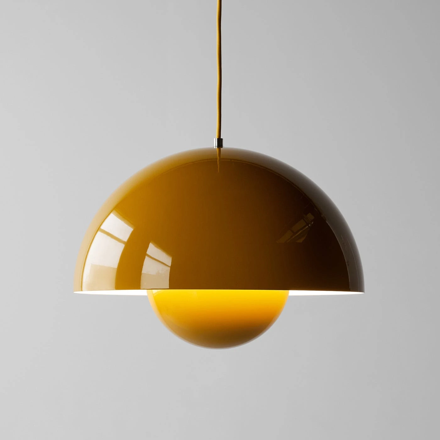 Introduce a piece of design history to your home with the Flowerpot VP7 Mustard Pendant Lamp. Its bold, graphic appearance was developed in 1968 by Danish design pioneer Verner Panton. With a minimalist silhouette featuring two spun aluminum semi-circles facing one another, it has remained just as relevant in the decades since. This lamp doesn’t shy away from vibrant color with its earthy yellow hue featured on the shiny lacquered surface with a matching textile cord. The canopy casts a warm glow in any space, from dining rooms and kitchens to bedrooms and home offices.