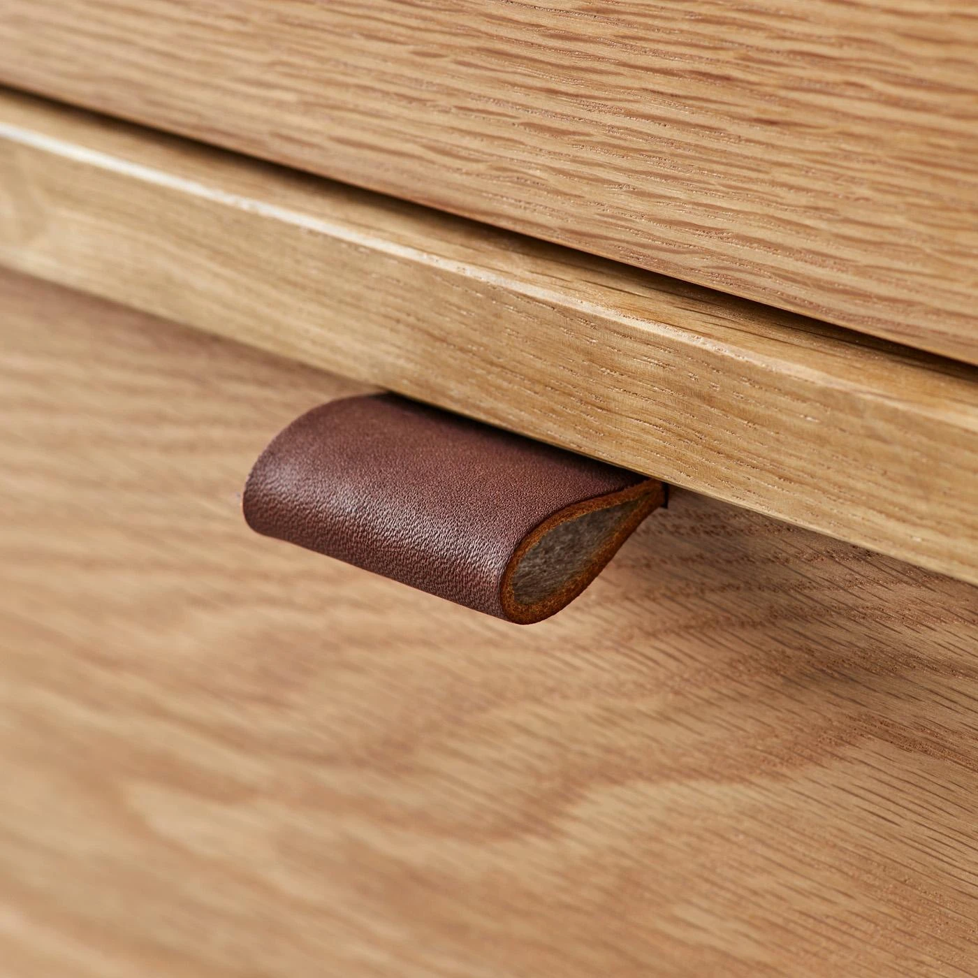 - Solid white oak top, white oak veneer over birch plywood substrate side panels, solid white oak legs, drawer divider rails and fronts, solid maple inner drawers and coin tray, full grain leather pulls, lauan plywood back.