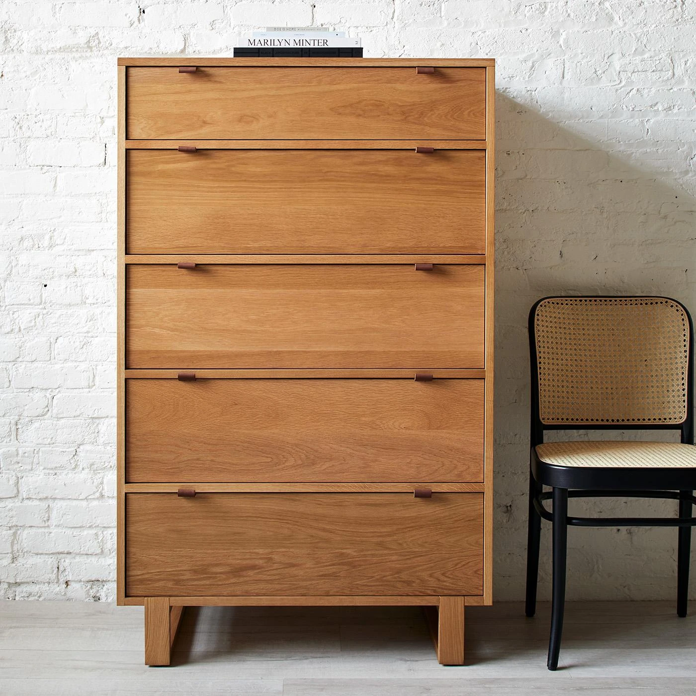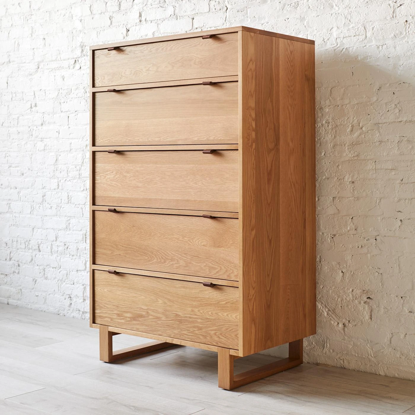 Distinguished by handcrafted details and crisp modern lines, the Fulton Chest features solid maple drawers with a dovetail joint, hand-stitched full grain leather drawer pulls, and a built-in coin tray. Framed in white oak with a soft close drawer system, this dresser’s smart and timeless design provides the perfect note of warmth to any bedroom.