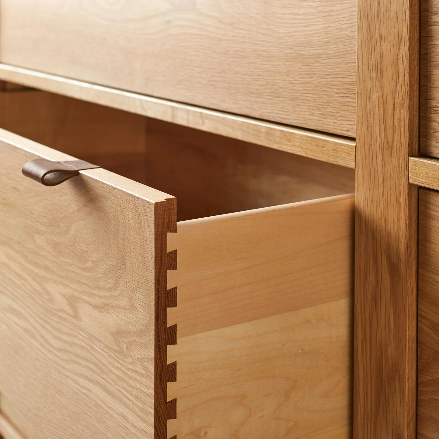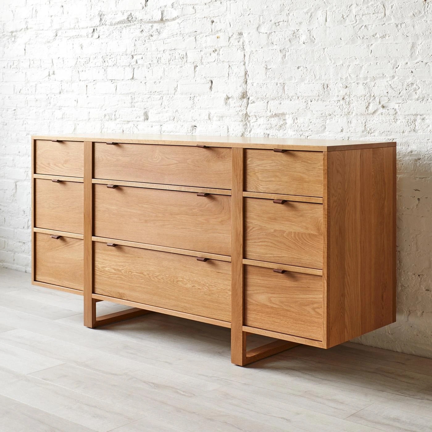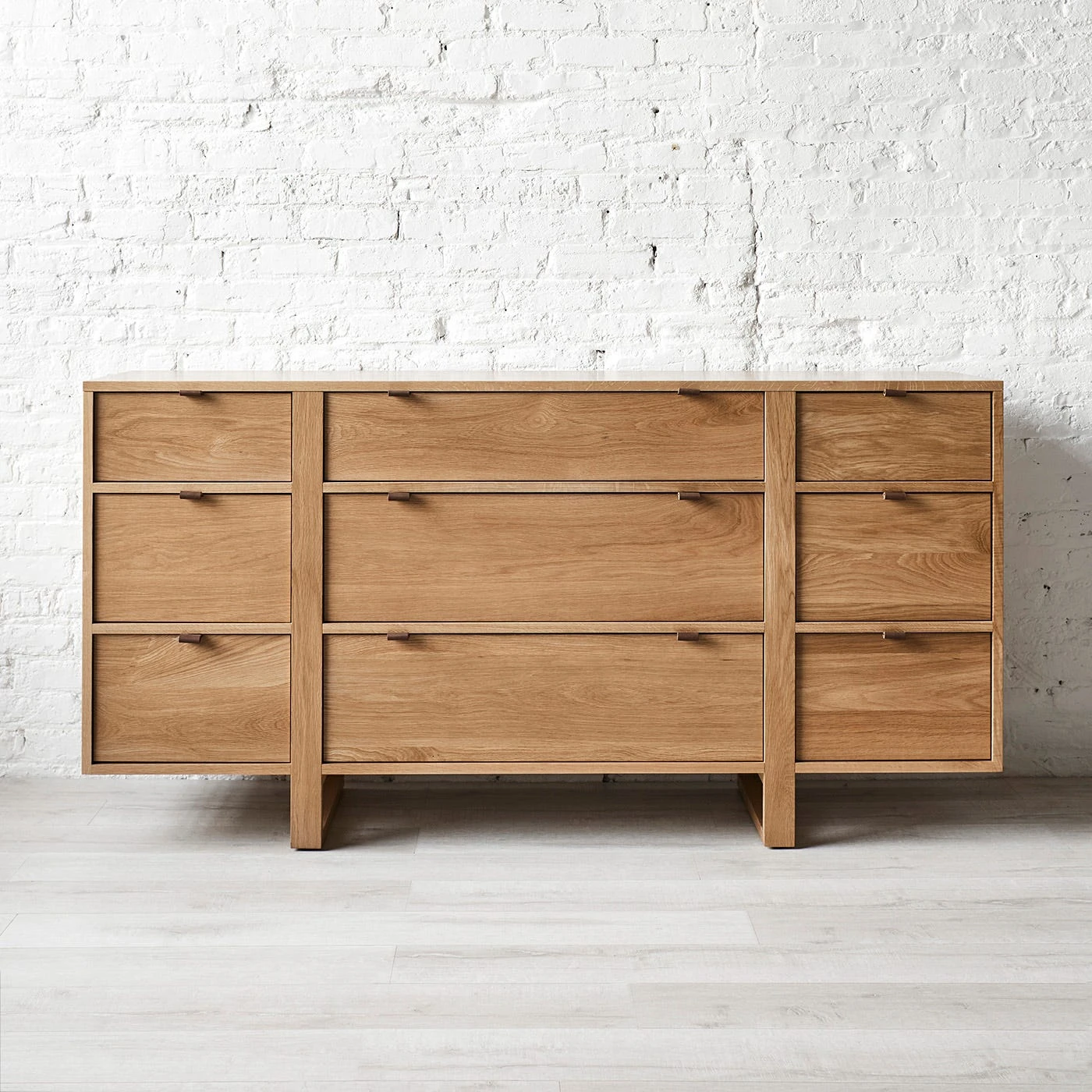 Distinguished by handcrafted details and crisp modern lines, the Fulton Dresser features solid maple drawers with a dovetail joint and hand-stitched full grain leather drawer pulls. Framed in white oak with a soft close drawer system, its smart and timeless design provides the perfect note of warmth to any bedroom.