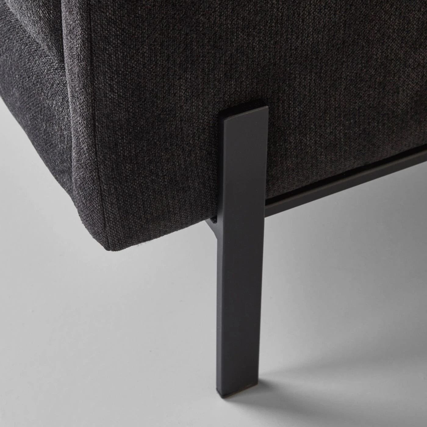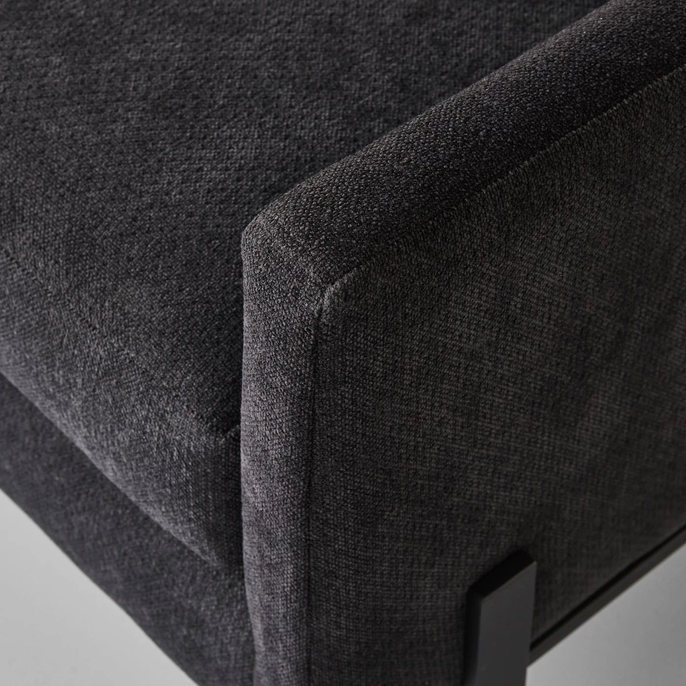 Quality you can touch. The Gunnison Chair is benchmade in North Carolina by a single craftsperson from start to finish. This minimal armchair features a velvety black performance fabric that is stain and odor resistant to stand up to everyday wear. The solid wood frame is constructed from kiln-dried maple wood that has been double-dowelled and glued, with blocked corners and joint breakers to form a solid base. It’s double padded with an extra layer of foam for durability and support. The inner no-sag springs are designed for long-lasting comfort. With sturdy black steel legs and a removable back cushion, this slim armchair is a stunning standalone piece. Comfort and great design combine in this modern accent chair.