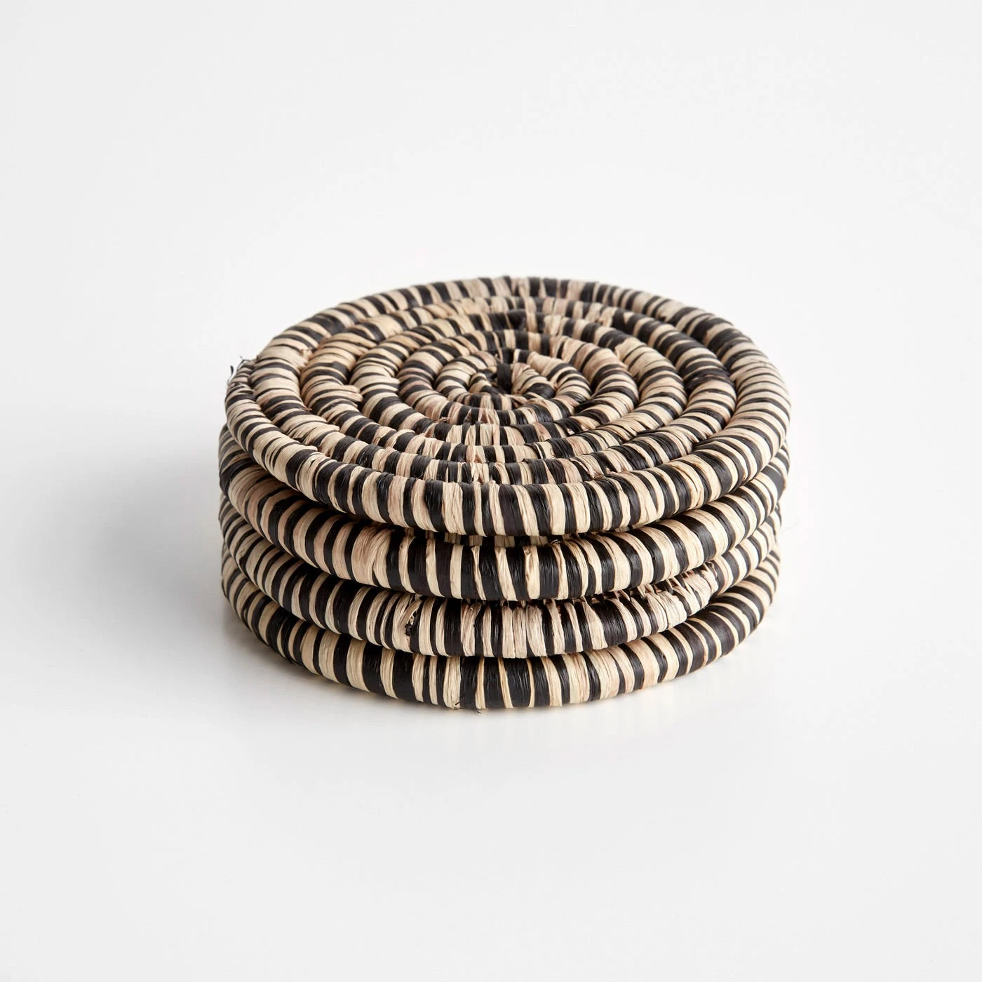 These fair-trade raffia coasters serve as practical yet attractive tabletop accents. Artisans in Uganda weave these high-quality, beautifully crafted goods in return for fair wages and benefits, creating community pride. A heathered pattern is developed using organic dyes for unique variations in each piece. The neutral tones blend in well with any environment while still making a striking statement upon display. Made from sustainable natural materials, these coasters help protect tables and countertops from condensation.