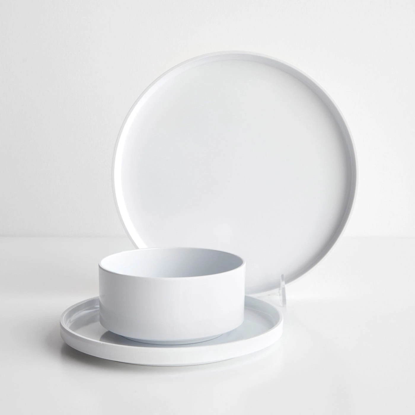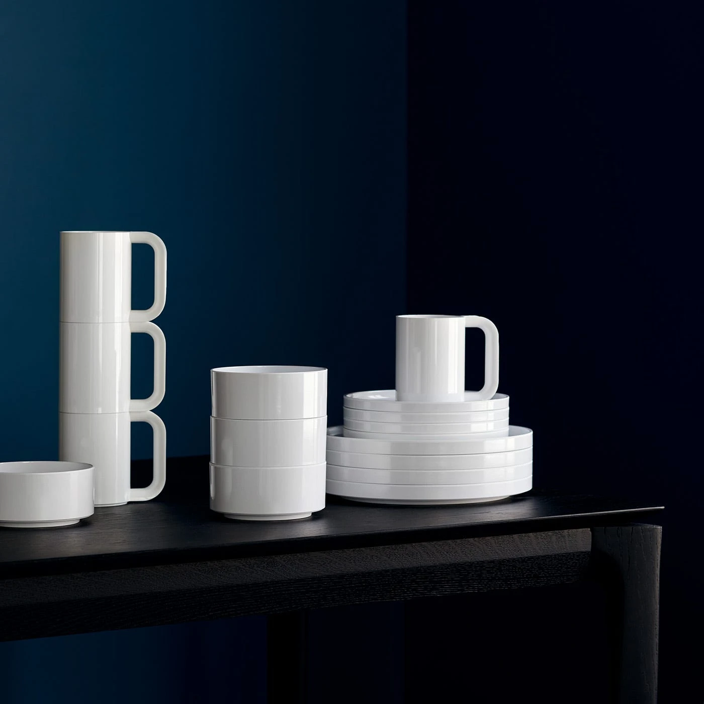Long-lasting in both quality and design, Heller’s melamine dinnerware was originally created by Massimo Vignelli in 1964 and began production under Heller seven years later. Known for its simplistic and functional, stackable design, Hellerware has been in production for over fifty years. Suitable for both indoor and outdoor use, these white plates and bowls are a piece of design history with a continued legacy to be enjoyed for generations to come. With its signature straight lines and under-sided lip, which allows the pieces to stack seamlessly, Heller’s modern dinnerware design in crisp white is a timeless classic.