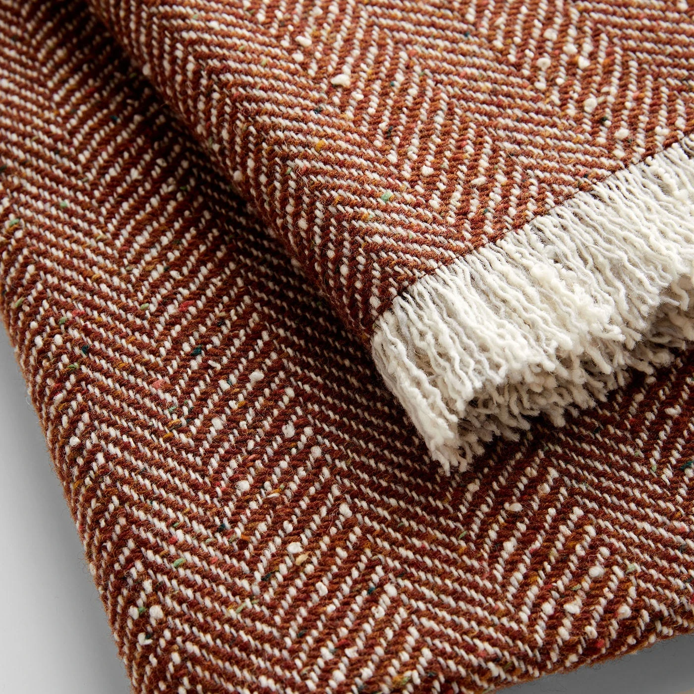 The Herringbone Rust Bracken Throw Blanket has deep roots in textile history. Created by Mourne Textiles founder Gerd Hay-Edie in the 1960s for use in clothing design, this signature herringbone pattern translates seamlessly as a modern interior fabric today. High-quality yarns in varying thicknesses give each throw a distinctive texture and a soft, snug feel. The woody autumnal tones of the Mourne Mountains have inspired this warm rust color, which contrasts with the lighter yarns that extend into a natural fringe at the edges.
