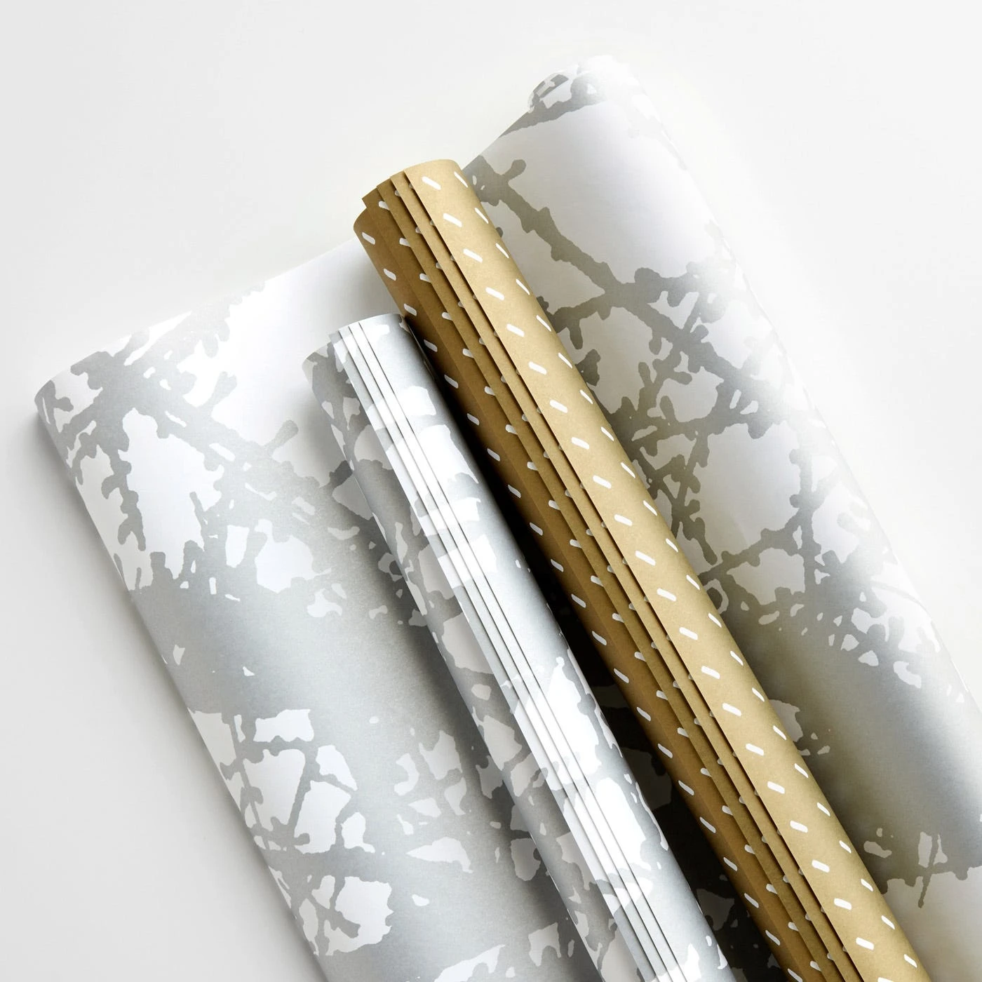 Featuring a simple organic print, Larch Silver Wrapping Paper is designed with artistic gift packaging in mind. Originally launched with our debut textile collection in 2006, the Larch pattern features a tree branch silhouette inspired by a photograph taken by Unison co-founder Alicia Segal at her family’s country home. The understated metallic sheen adds a special feel to any gift, and the neutral tones can be combined with ribbons and bows in any color. This high-quality silver gift wrap is made from uncoated matte text weight paper, giving it a generous size and weight that allows for crisp folds.