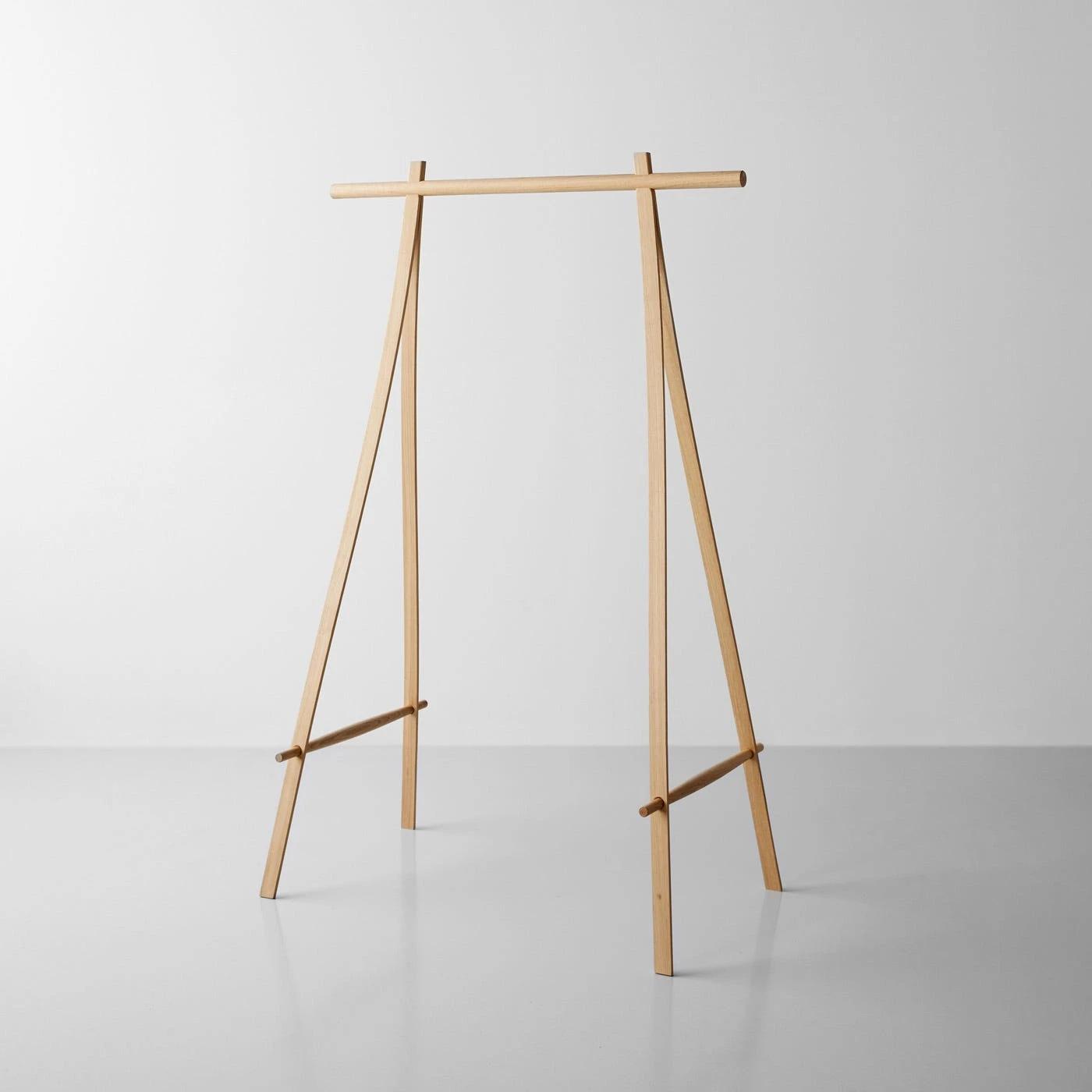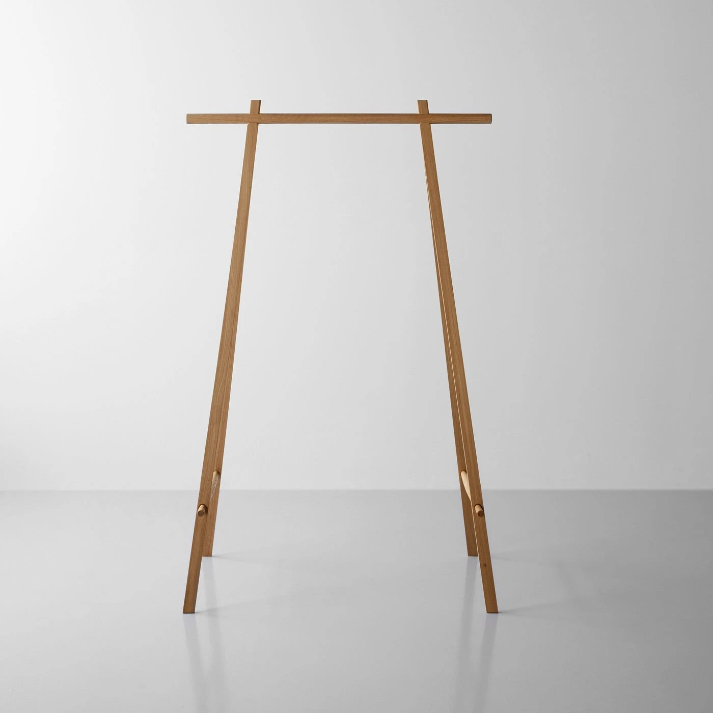 Designed by STUDIO 0405 for Made By Hand, this coat rack transforms practical design into a work of art. Crafted using traditional Japanese joinery techniques, the smooth pieces of the solid oak rack lock together easily with no hardware or tools required. Trestle-style legs bow out gracefully like the branches of a tree, and a thin strip of brass accents the top bar to add a refined detail that allows hangers to slide easily. This 39-inch-wide coat stand and clothing rack is beautiful enough to keep out for everyday use in hallways, entryways and bedrooms. The pieces lay flat when disassembled, making them easy to tuck away.