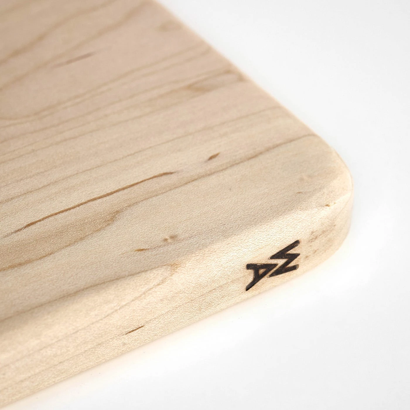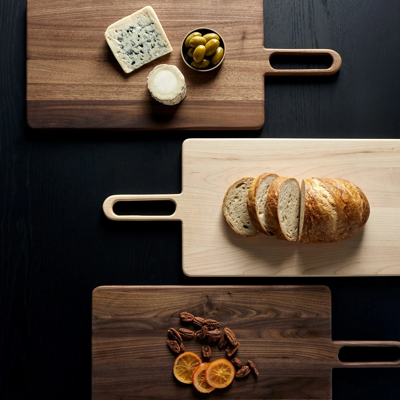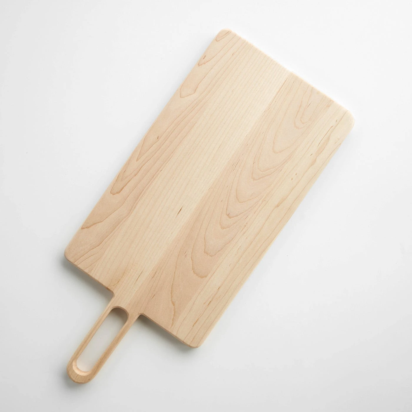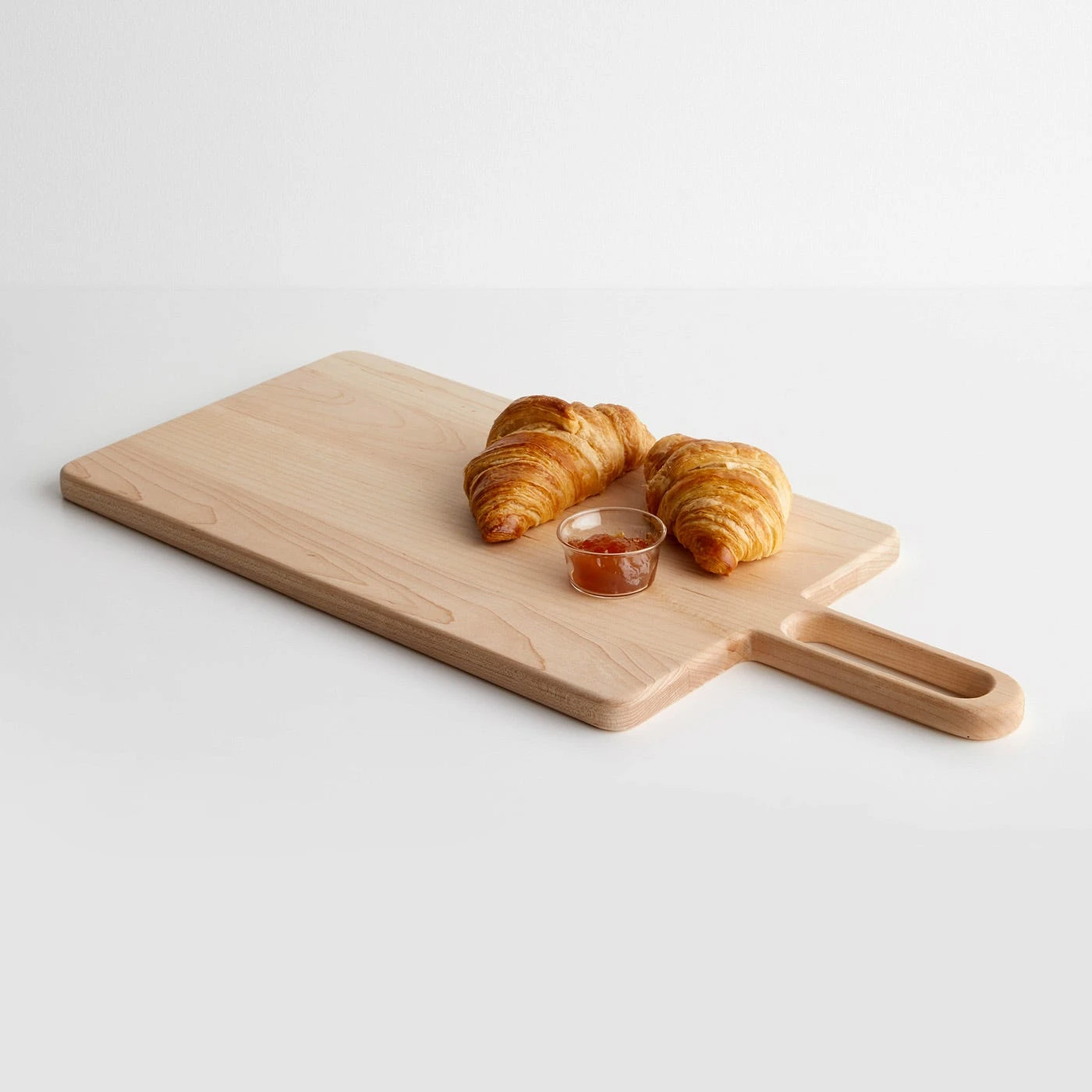 Serve full loaves on this expertly crafted Maple Big Bread Board. Designed by Melanie Abrantes, each board showcases the natural beauty and light tone of the FSC-certified solid maple wood and is finished with a protective food-grade mineral oil and beeswax. Although the narrow size and shape is made with bread in mind, the board can be endlessly versatile for serving appetizers, snacks and more. A looped handle also makes it easy to hang as a display when not in use. Each board is hand crafted in Eastern Pennsylvania and finished in the artist’s Oakland, California studio.