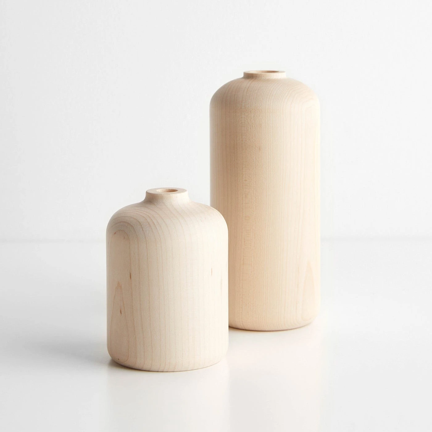 The Maple Bud Vase brings a modern, minimalist accent to any part of the home. This piece is carefully crafted in artist Melanie Abrantes’ Oakland, California studio from a solid piece of light-toned maple wood. The natural markings and grain patterns of the material make each vase undeniably unique. At 4″ tall, it’s sized just right for shorter stems, and a glass vial is included to allow for one or two fresh floral stems to be put on display. Pair this with the taller 6.5″ vase to create a multi-level display.