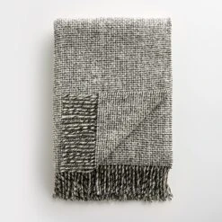 Handwoven from 100% pure Merino Donegal yarn, this thick and cozy wool throw was crafted by Mourne Textiles in the Mourne Mountains of Northern Ireland. Mourne Textiles is run by the family of Gerd Hay-Edie and still produces high-quality textiles in the original mill. Hay-Edie’s lasting impression as a textile designer has spanned decades. Traditionally spun Merino Donegal wool creates a unique weave pattern, with small flecks of color from the natural fiber peeking out. What’s more, each blanket is finished with purled fringe ends. Beautifully textured, this plush throw will leave you warm and snug no matter where you are. The flecked pattern on the Monochrome IV has a dominant color of ivory with black flecks that appear gray when viewed from a distance.