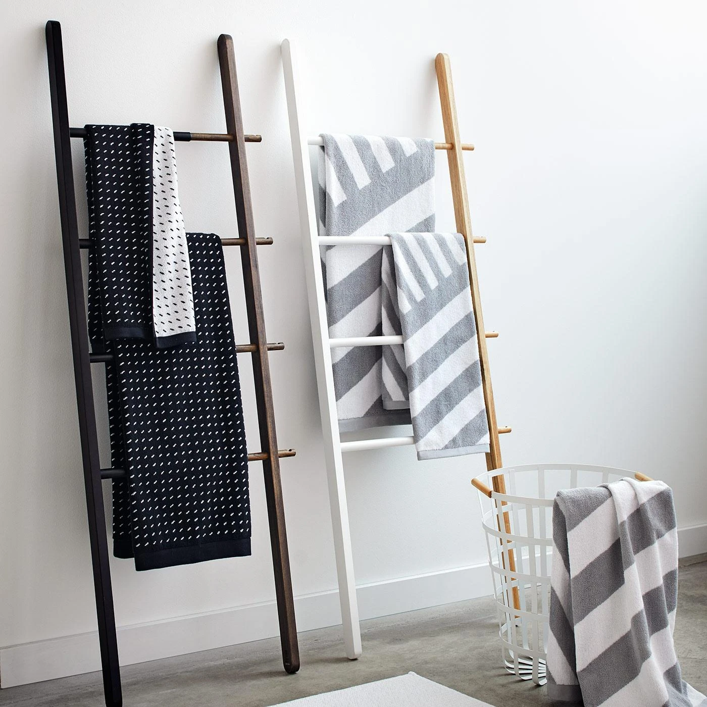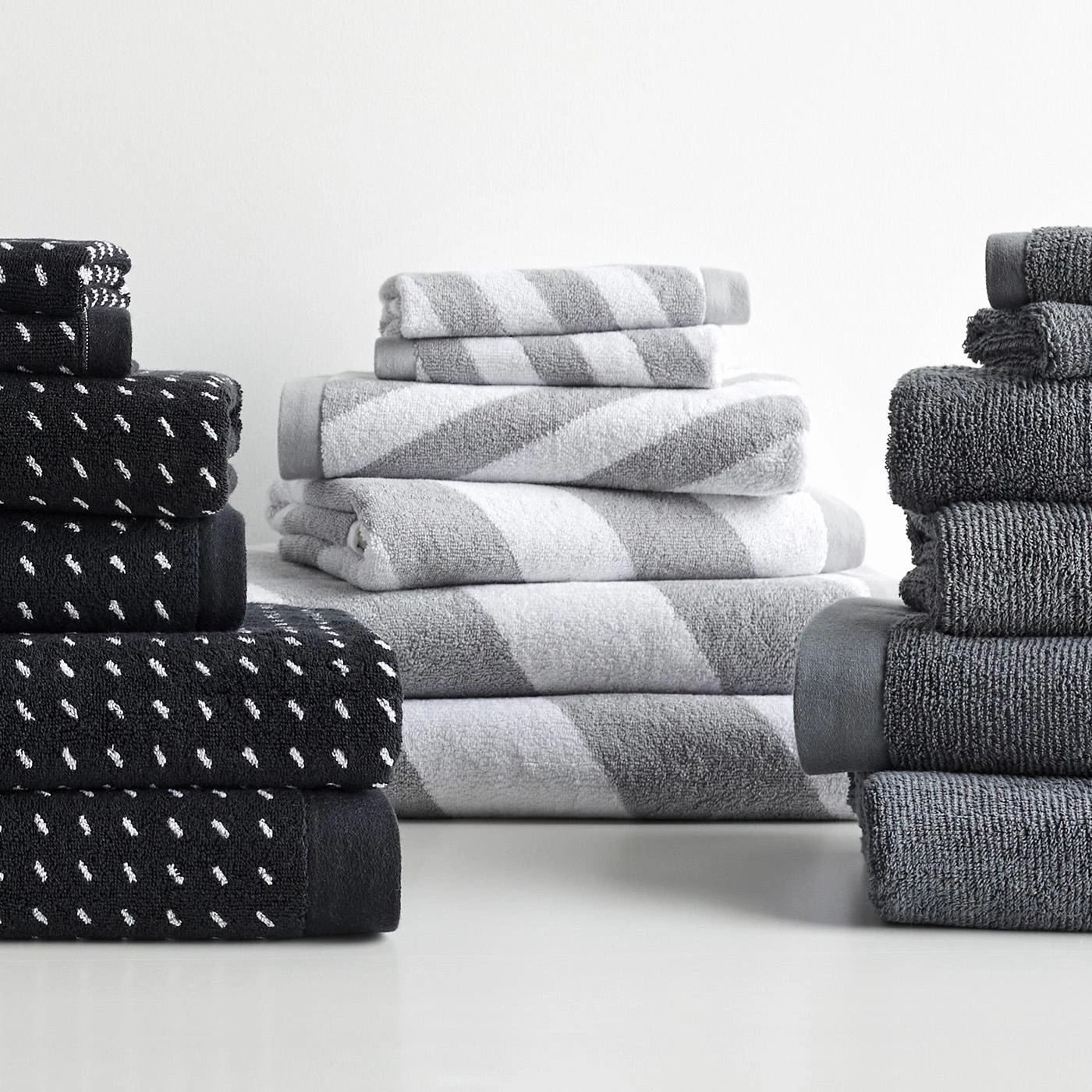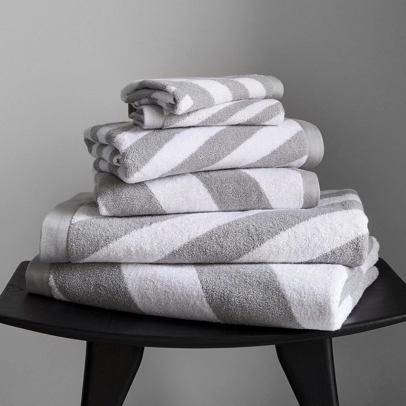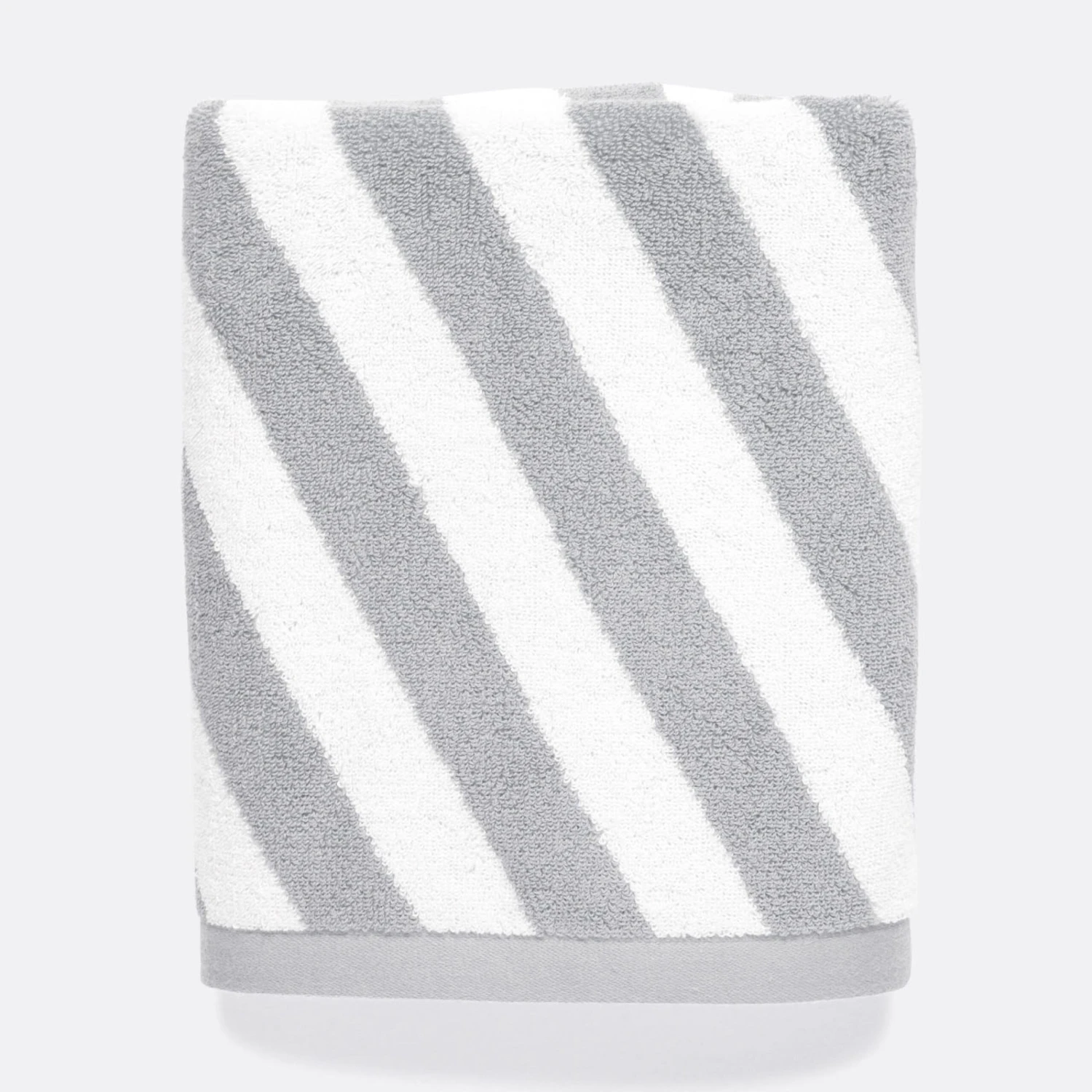 Nautical goes neutral. Plush cotton striped towels add dimension to your bath. Reversible and asymmetrical with a hanging loop. The generous size of our hand towel is reflective of the dimensions of a guest towel, giving you more versatility wherever you may need it. Purchase the bath towel, hand towel and washcloths individually or grab them all for a complete look.