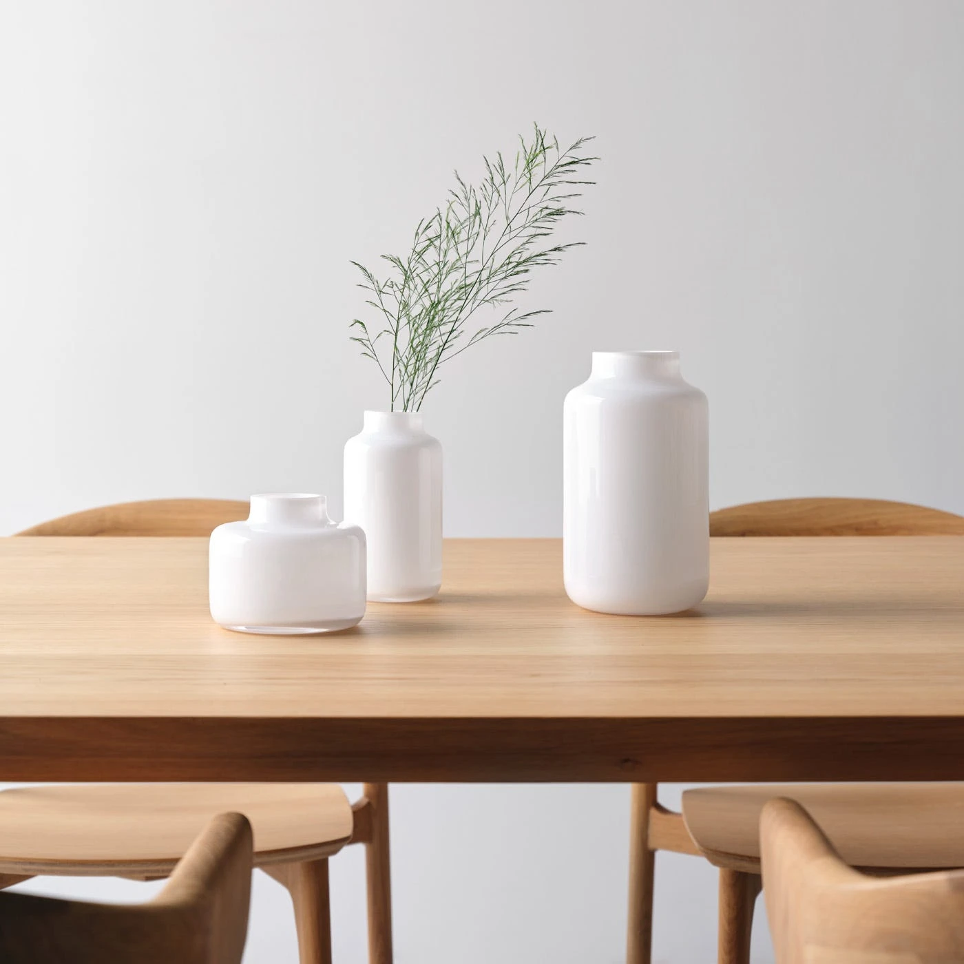 The Mini Magnolia Opal White Large Vase embodies simple, modern design. This tall, wide vase features a crisp, fresh white color. The opening offers enough room for a small bouquet of flowers or a few sprigs of greenery. The cylindrical, straight-sided design is complemented by gentle curves at the top and bottom and a slightly fluted neck. Each white vase is hand blown in Turkey by master glass blowers, resulting in a sturdy, substantial piece exhibiting timeless beauty. Combine with the medium and wide vase sizes for a multi-level display.