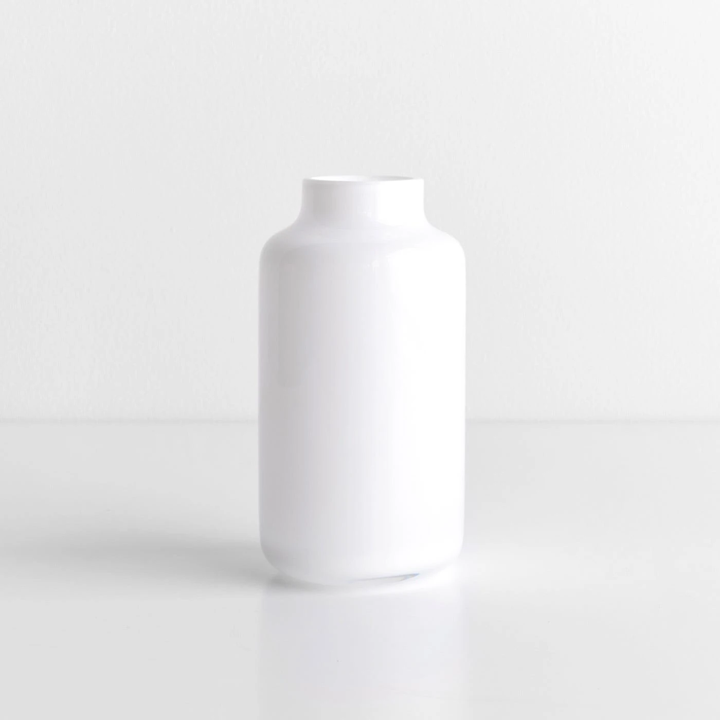 The Mini Magnolia Opal White Medium Vase embodies simple, modern design. This tall, narrow vase features a crisp, fresh white color. The opening offers enough room for a small cluster of flowers or greenery. The cylindrical, straight-sided design is complemented by gentle curves at the top and bottom and a slightly fluted neck. Each white vase is hand blown in Turkey by master glass blowers, resulting in a sturdy, substantial piece exhibiting timeless beauty. Combine with the large and wide vase sizes for a multi-level display.