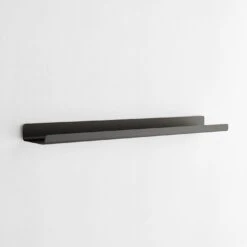 This sleek, modern wall shelf provides streamlined storage for every room in the house. Hang in the entryway to keep keys and sunglasses within easy reach or tack a few in the bathroom to house toiletries. Group on a living room wall for a unique display of beloved photos and artwork. Practical and minimal, this shelf offers the perfect framework to inspire a creative display. Made from durable titanium-coated stainless steel, this understated wall shelf is built to last. The large wall shelf can easily showcase a few magazines or a pair of vinyl album covers.
