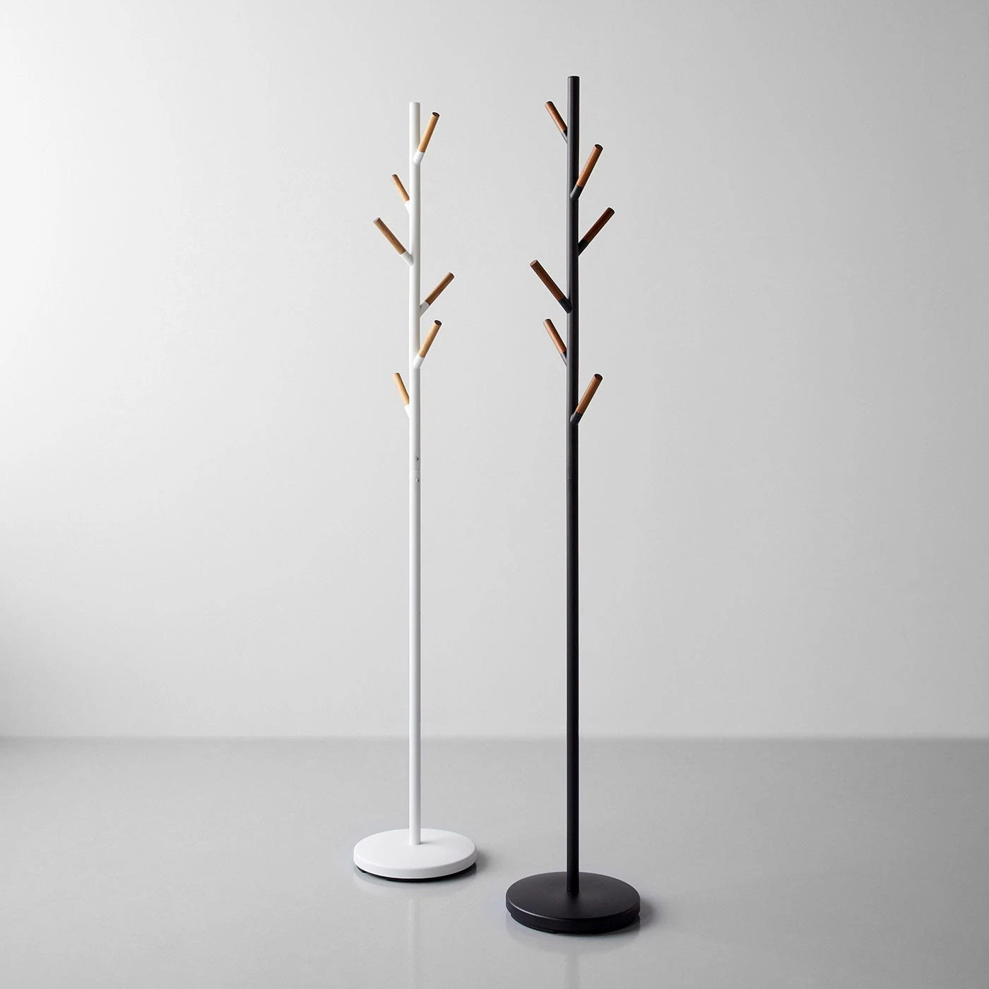 Designed in Japan, the Nara White Coat Tree is slender enough to fit into small spaces, yet sturdy enough to maximize storage. The minimal design has six wooden pegs that are staggered to represent tree branches and provide optimal space to hang coats, bags, hats and scarves. This power-coated steel coat rack is durable, with a weighted base designed to keep it upright and planted firmly in place. Perfect for entryways, offices and bedrooms, this coat tree has a simple silhouette, small footprint and solid design that make it a quality addition to any space.