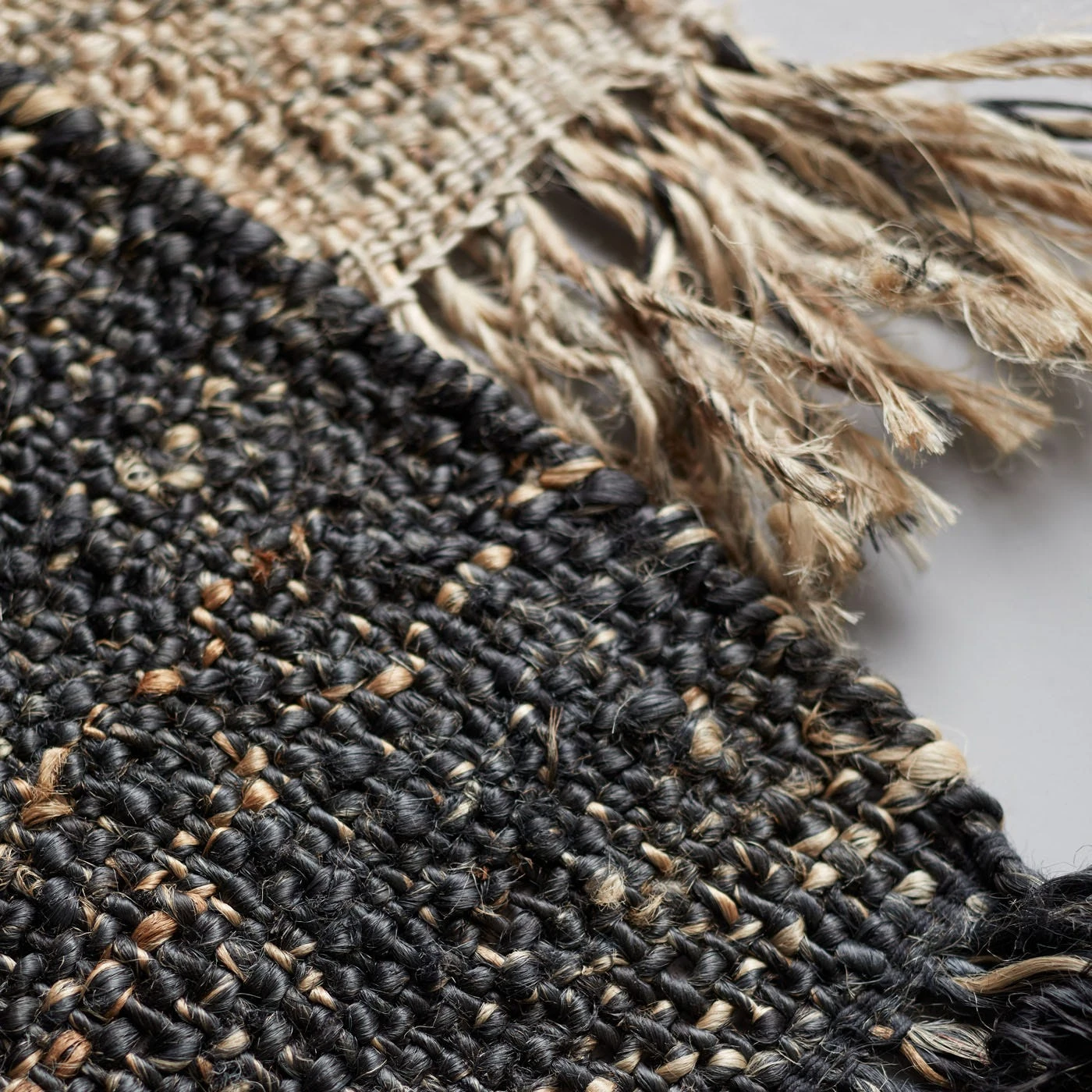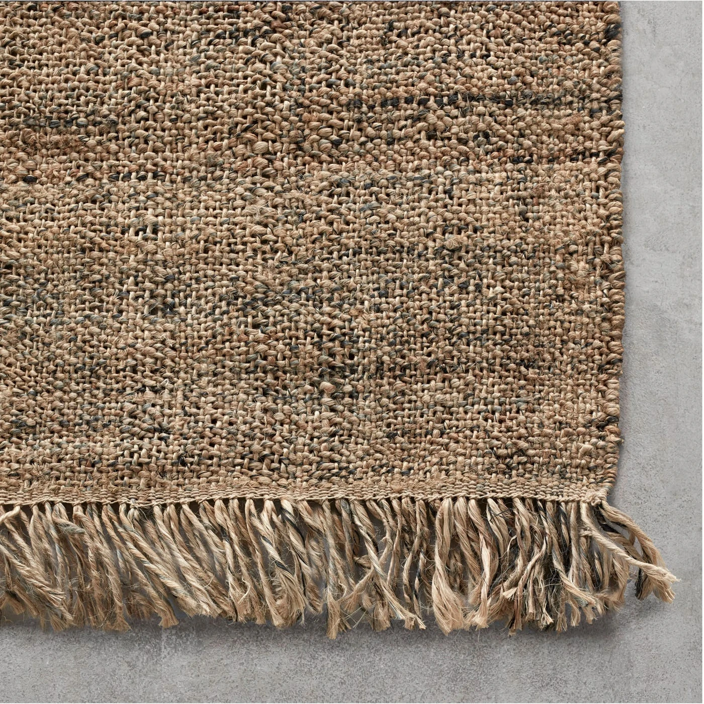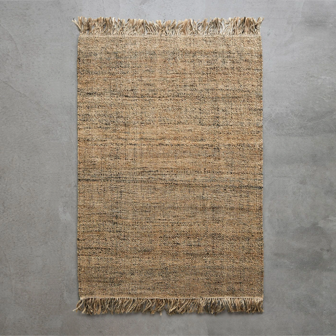 Warm and grounding, this natural jute rug brings an organic touch of texture into your home. It’s handwoven giving it that beautiful, slightly imperfect quality. Natural jute fibers are twisted with black and gray ones providing depth and contrast. It’s double-sided, so you can flip it over for even wear. Fringe on the ends adds character and highlights the natural jute. Perfect for a sunny seating area or beneath your favorite reading chair, this rug shines without grabbing attention.