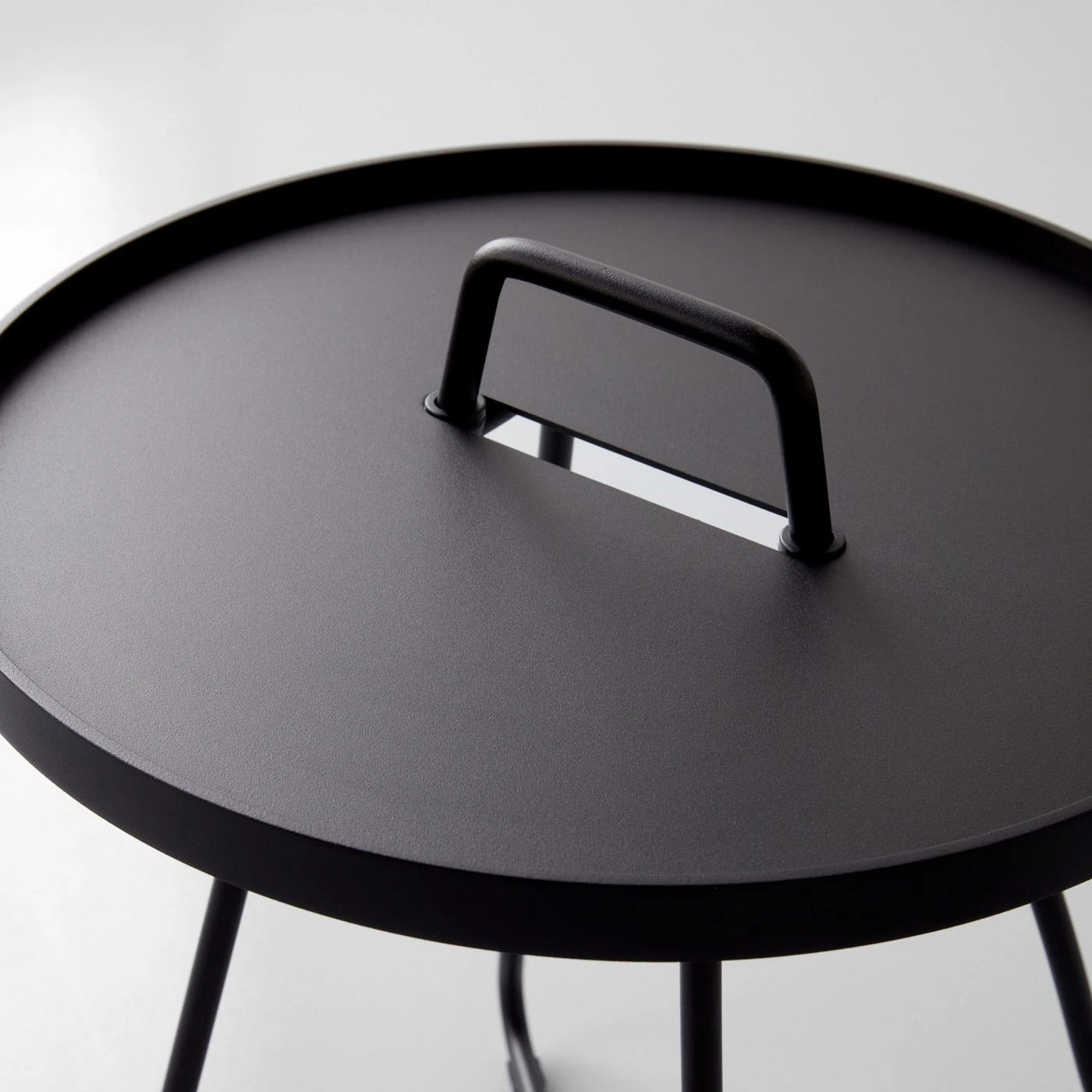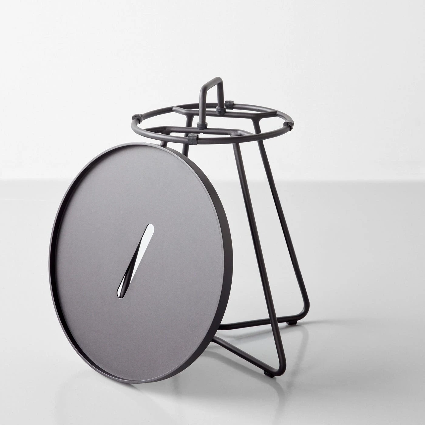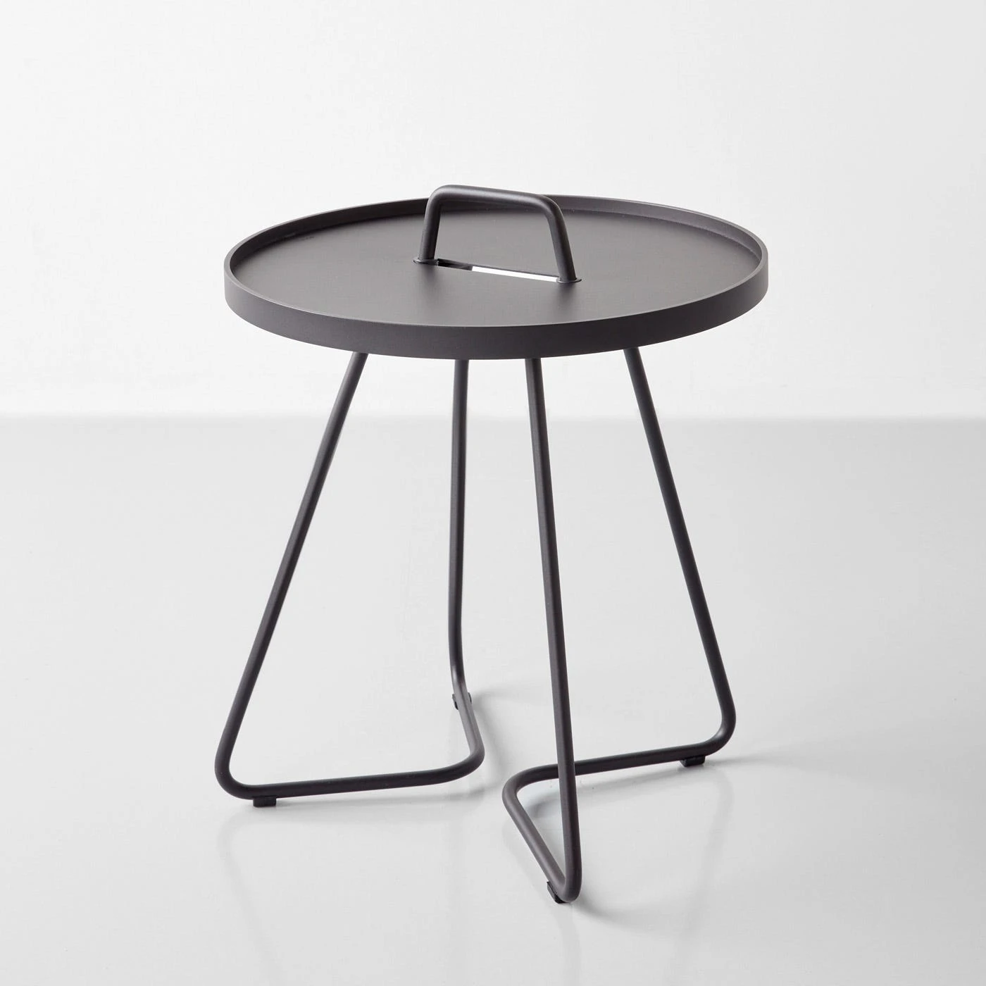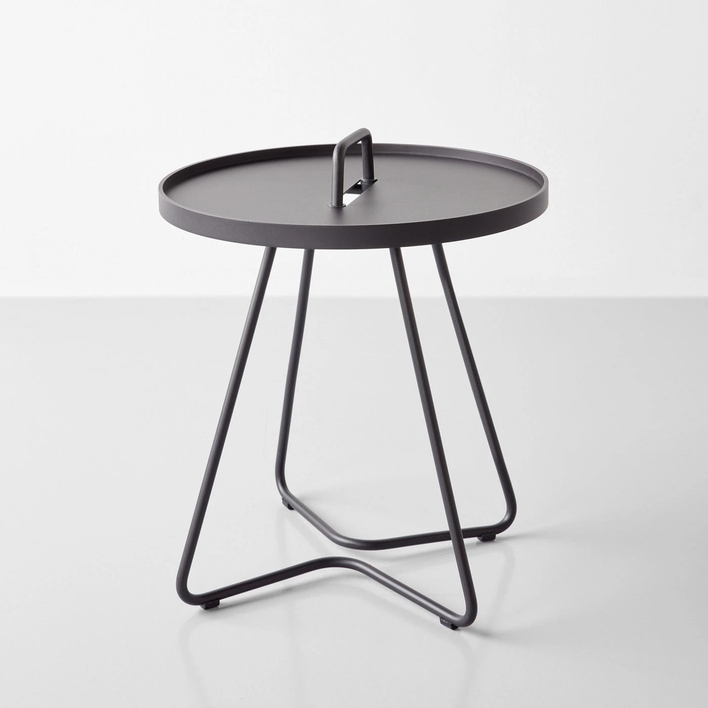 The On The Move Black Side Table makes indoor and outdoor spaces more versatile. The slender rod frame features a piece that extends through the top, doubling as a convenient handle. Because this side table is made from sturdy yet lightweight aluminum, it’s easy to move around as needed. Rubber feet on the bottom prevent surface scratches and keep the table in place. As another unique detail, the tabletop lifts off the frame, allowing it to function as a handy serving tray for carrying drinks outside and facilitating easy clean up.