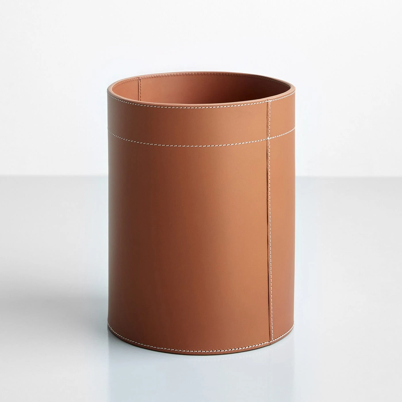 The Orskov Classic Cognac Leather Waste Bin is the perfect example of the enduring functionality of good design. The bin was first introduced in the 1960s by Torben Orskov, the founder of Orskov Copenhagen, and has been produced ever since. The light brown leather waste basket is now made of recycled, vegetable-tanned leather accented by visible white stitching. The smooth leather is thick and sturdy, allowing the round bin to maintain a structured shape. This piece of design history features a rich, warm caramel color which adds an inviting accent to an entryway or home office.