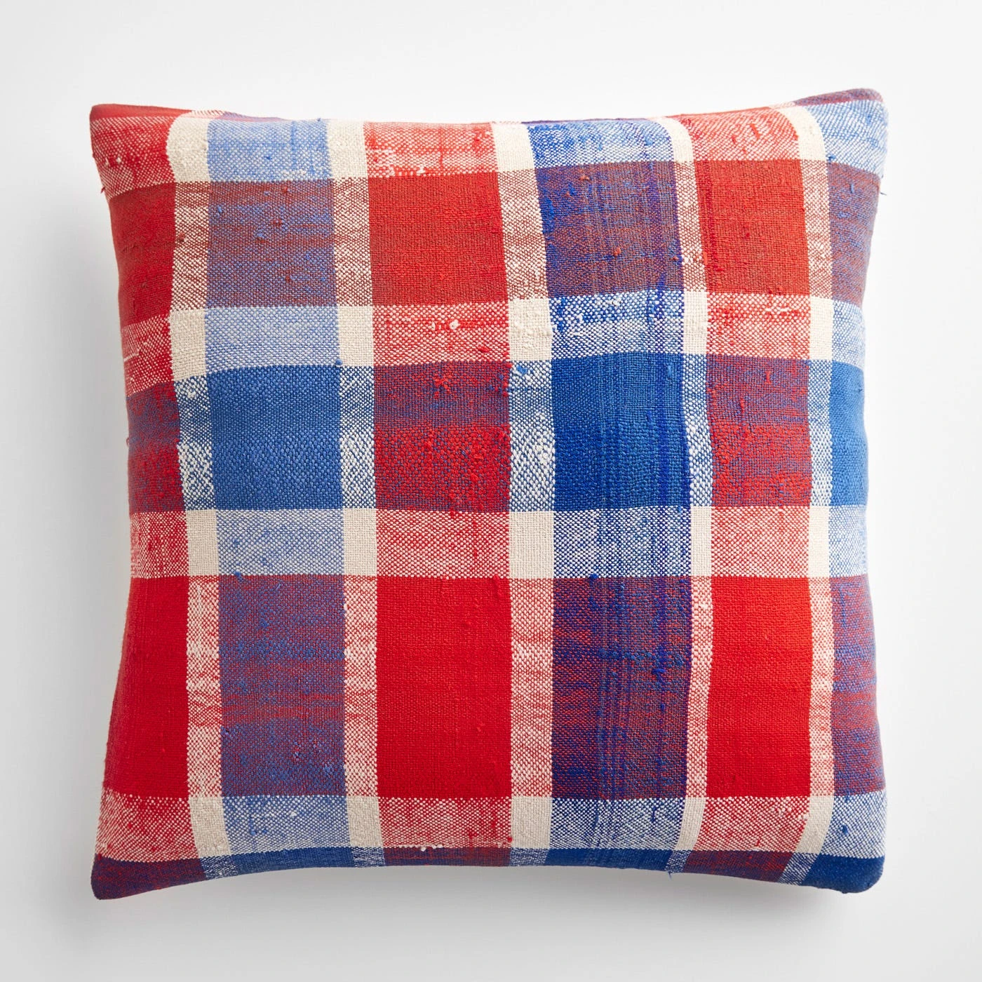 The 20″ x 20″ Rebia Plaid Throw Pillow Cover instantly infuses homes with a splash of bold color with its vibrant blue and red plaid pattern. These covers are made from vintage Moroccan fabrics created with weaving techniques passed down through generations. The beautifully handcrafted fabrics are sourced from the Middle Atlas mountain range region of Morocco, then carefully cut to create individual, one-of-a-kind pillow covers. The back features a heavier linen and cotton blend fabric in a neutral beige color. Simply slip your pillow of choice inside and close with the concealed zipper.