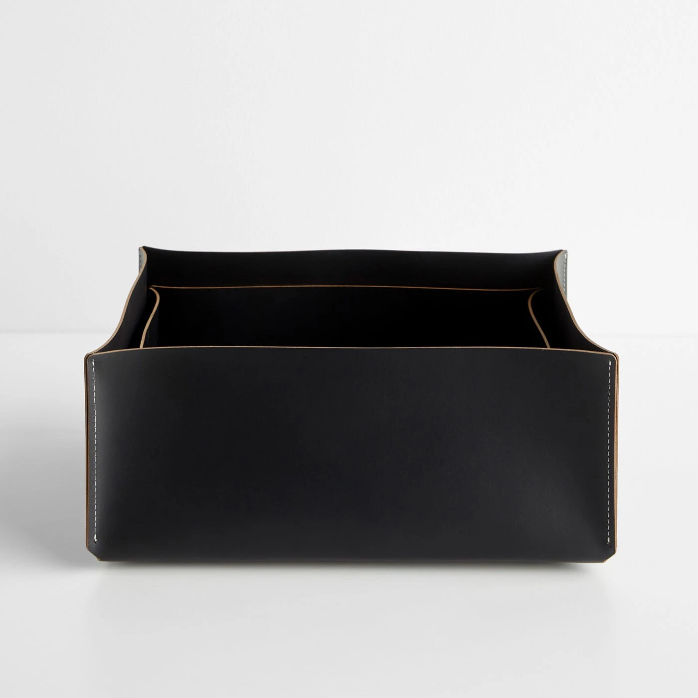 Your sustainable storage solution. Crafted in Spain, these bins are created from 100% recycled leather that’s been sourced from discarded pieces from the leather industry. After being recovered, the off-cuts are cleaned and recycled, then bonded together with latex and natural fibers to create a new and sustainable material. Exposed stitching adds a distinctive detail to these carefully crafted bins. Place them on a shelf or inside a cabinet and maximize your storage space. This black leather set comes in two different sizes to use in your bedroom, living room, entryway or office.