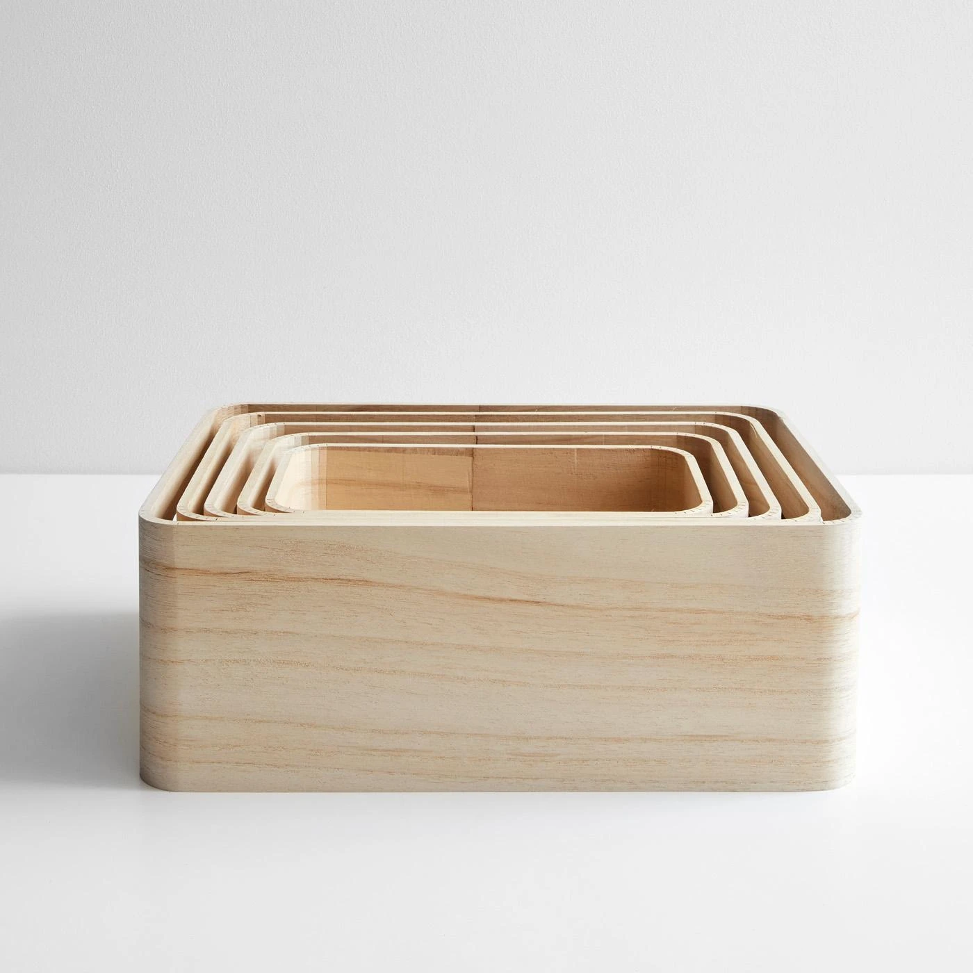 These simple and practical storage boxes are the perfect fit for modern homes. Exclusive to Unison and made of durable Paulownia wood (so light, it’s balsa-like), they keep everything from dry spices to condiments tidy, making for a cohesive kitchen. Or use them in the living room for magazines and toys, bedroom for accessories or shoes, or bathroom for all your bath basics. Each set includes five different sizes that nest into one another when not in use.