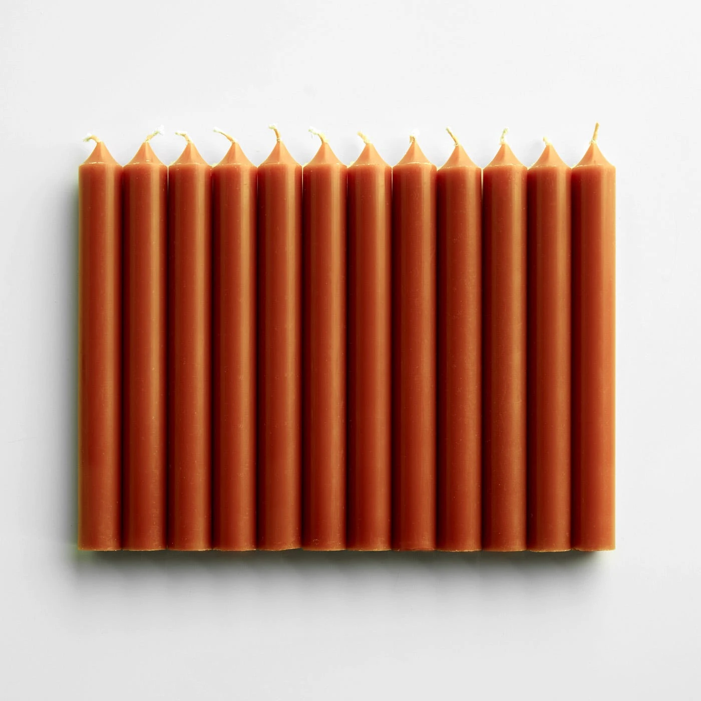 Set the table with a set of twelve Spice Taper Candles. These decorative accents are made in France by Bougie la Francaise, a family business which has been making candles since 1902. For five generations, they have used vintage machines to produce finely crafted candles that create a warm, inviting atmosphere and a pleasing glow for entertaining and decorating. Made from highly refined, unscented paraffin wax, these orange-red candles feature a modern, non-tapered cylindrical shape. The smokeless, dripless design features a burn time of seven hours.