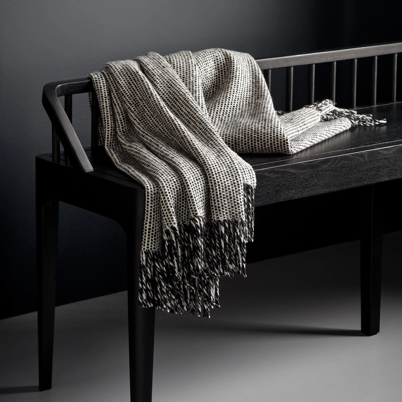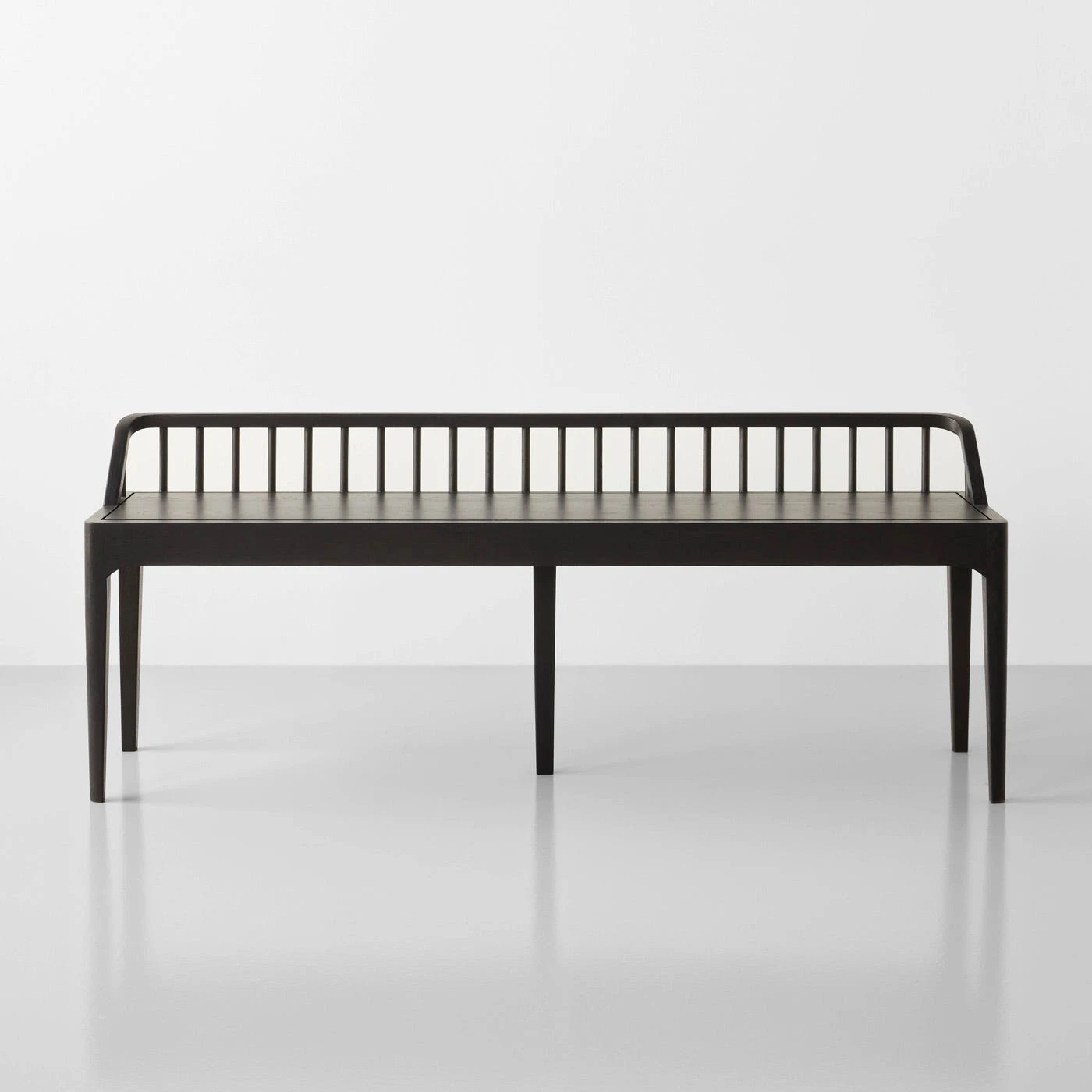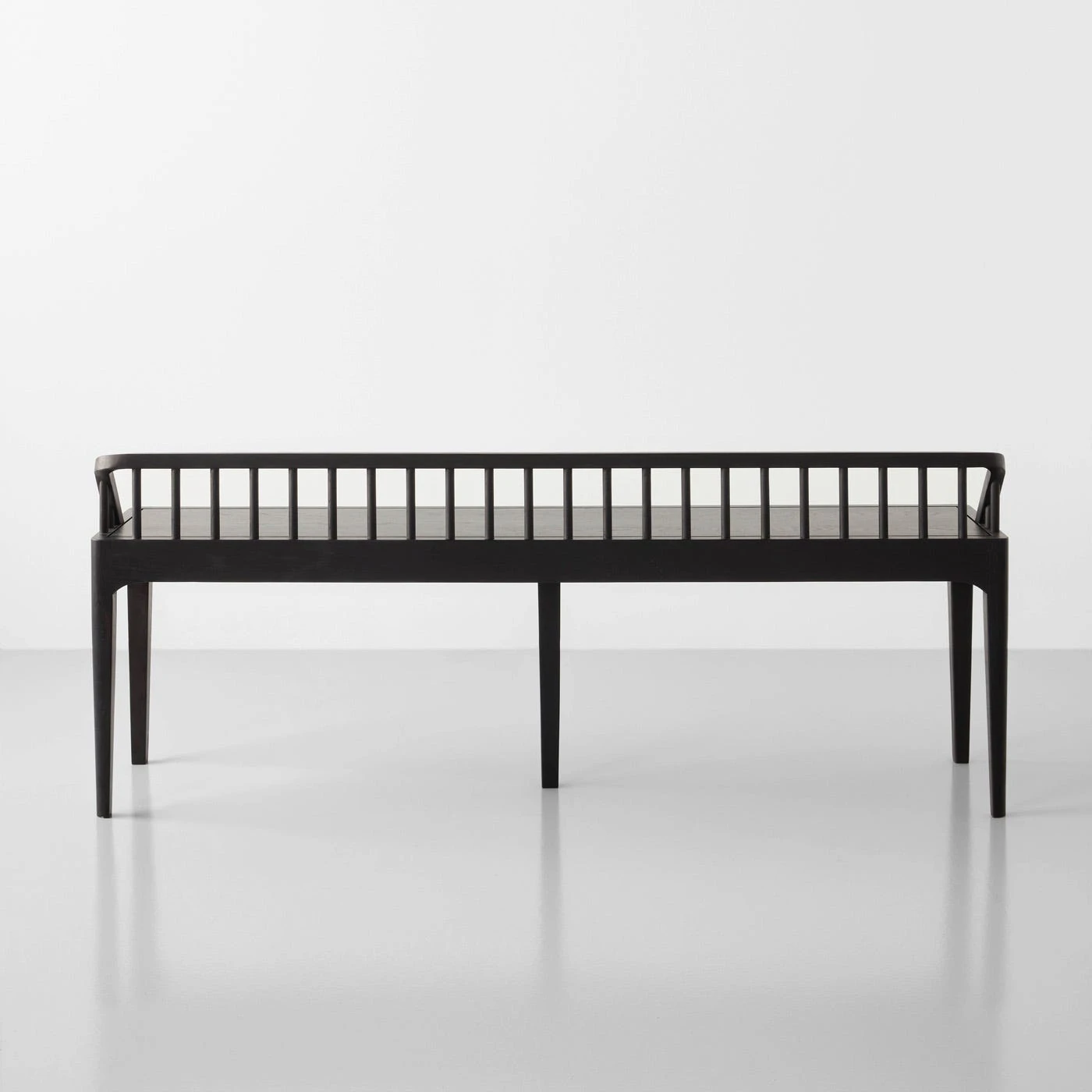 A low back marked by distinctive vertical lines makes an impact in this richly stained black colorway of the popular Spindle Black Bench. Sized for convenient seating in multiple spaces within the home, this bench serves as an inviting entryway accent or dining table companion. Placed along the foot of the Spindle Bed, it provides a perfect complement to the similarly designed headboard. The richly stained wood is lacquered for protection then brushed to reveal the depth and texture of the natural wood grain. This bench is crafted from sustainably sourced solid white oak and made with a no-waste philosophy to ensure all cuts and scraps go to good use.