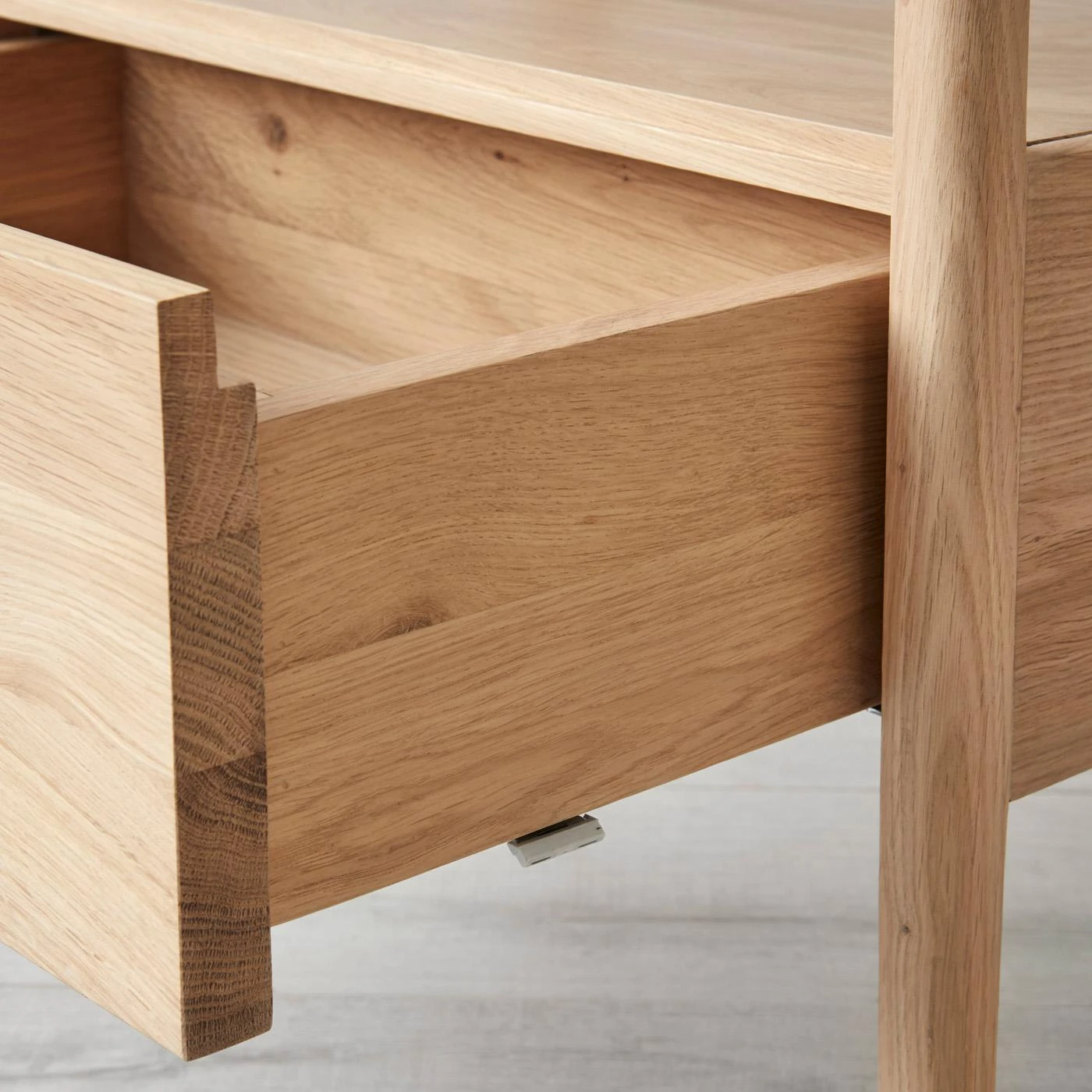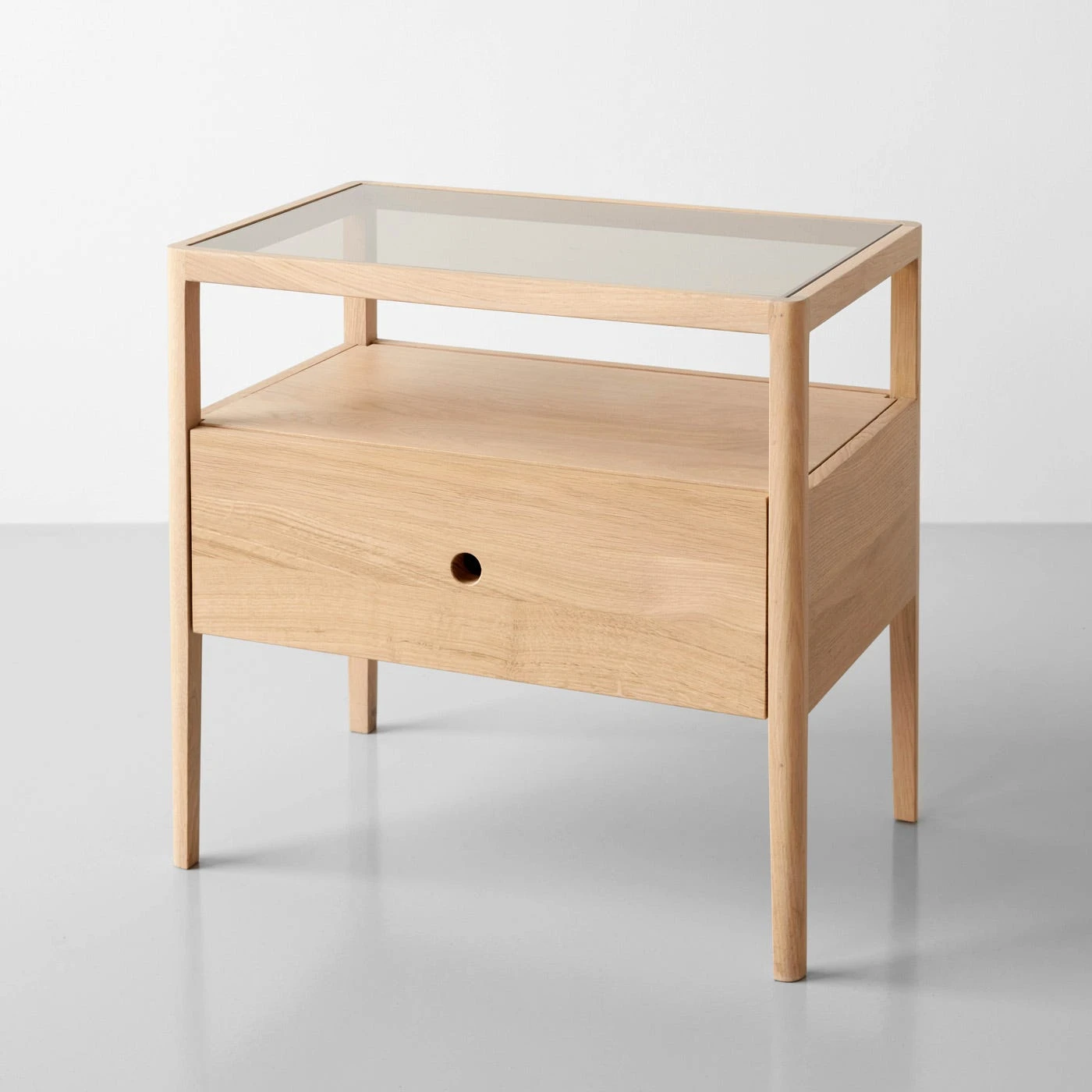 A modern classic at your side. Make a statement with a white oak nightstand that makes a distinguished presence with clean lines, straightforward functionality and natural wood grain beauty. It has a glass top and simple drawer to cache away all of your nighttime necessities. Along with being an ideal bedside piece, it works as a side table in your living room. Consider it the well-crafted supporting player any space needs.