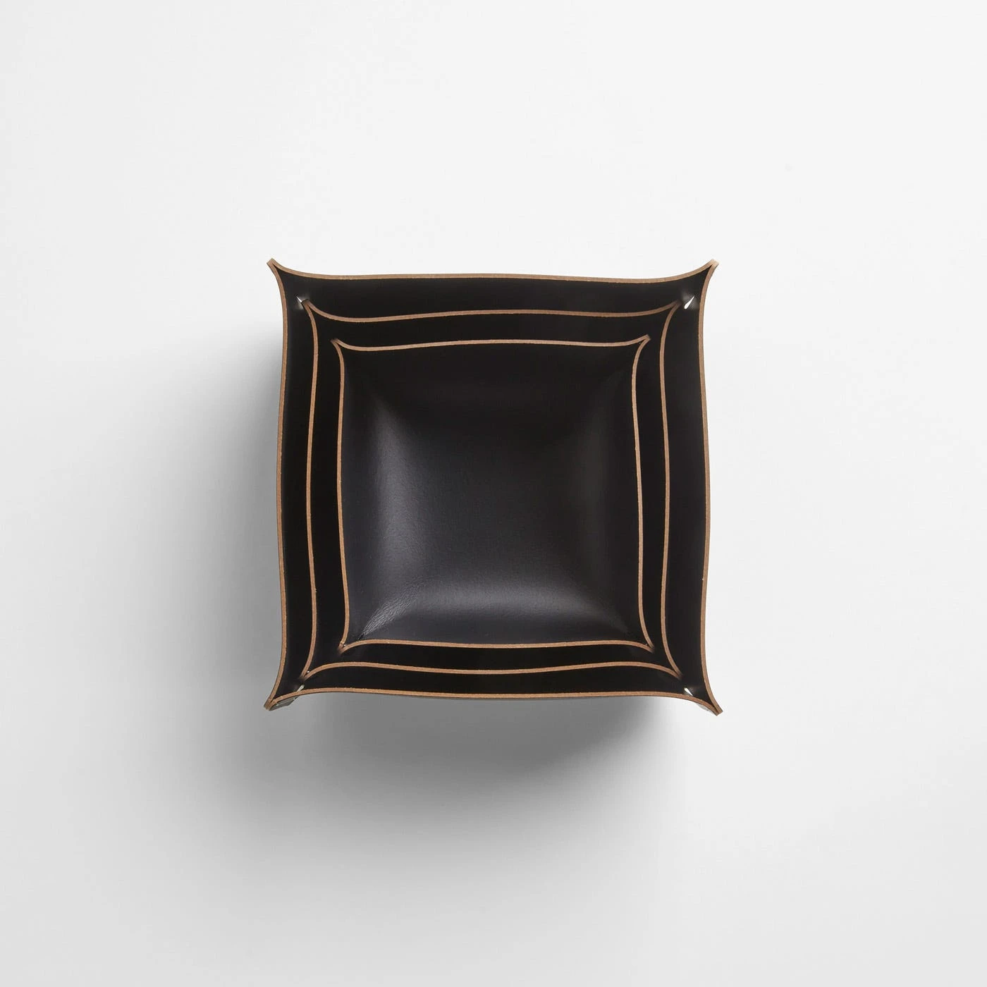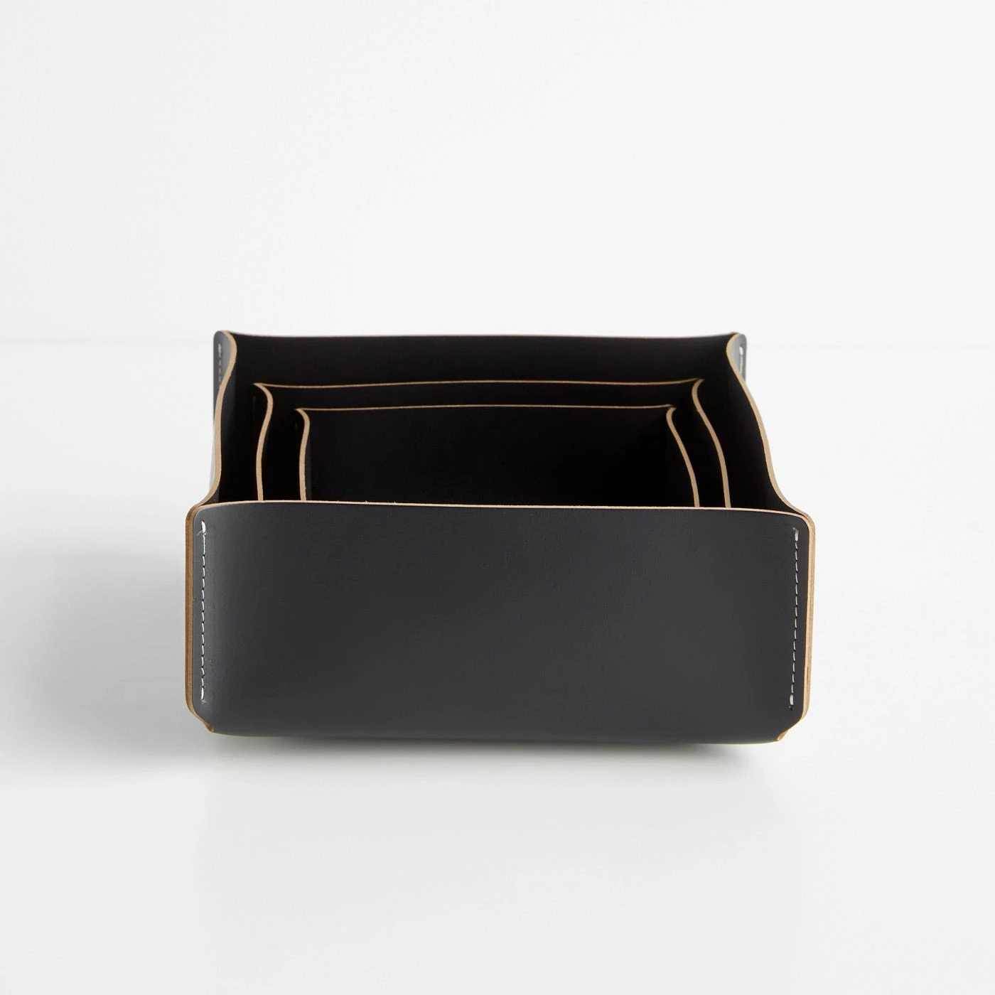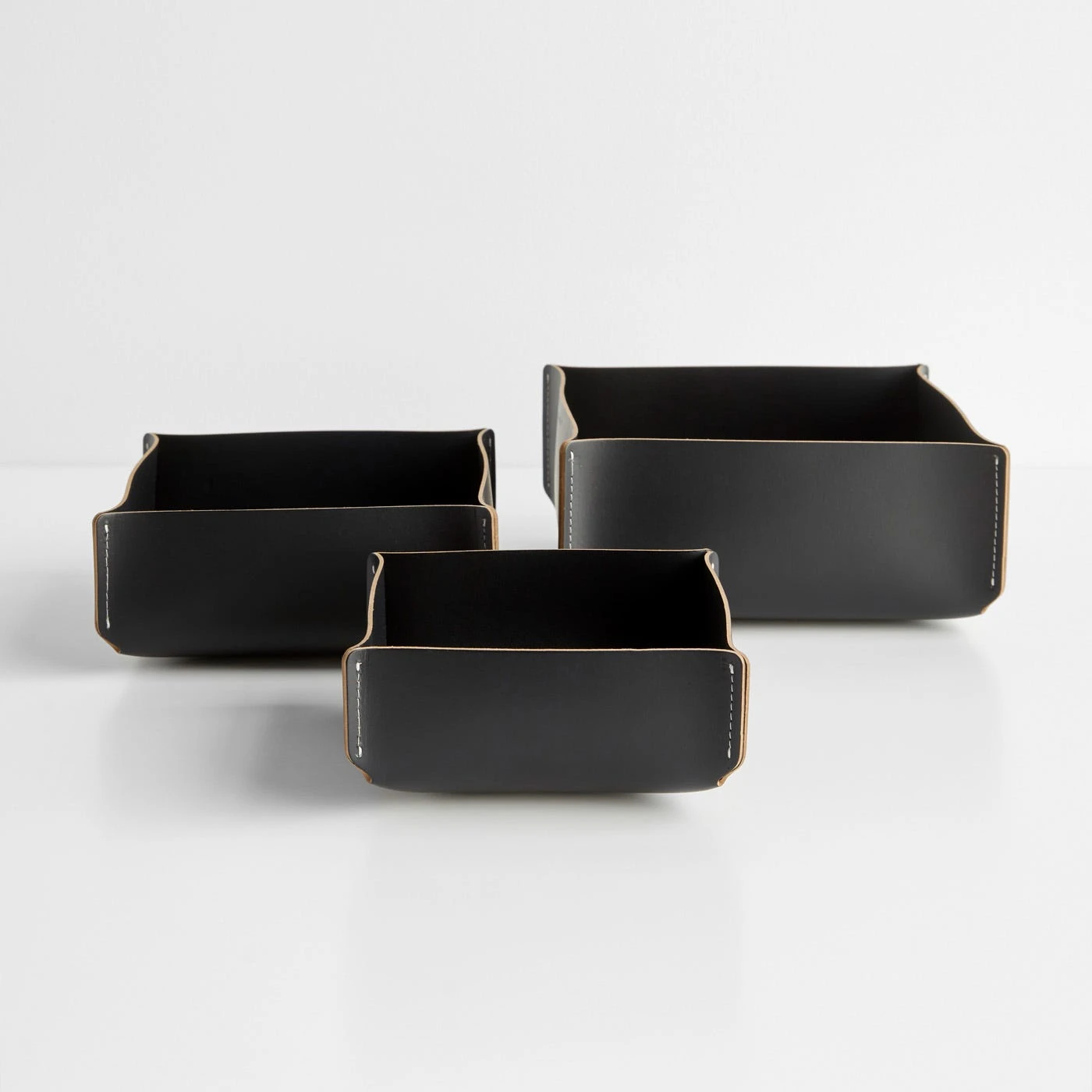 Made in Spain from 100% recycled leather, these leather storage bins give new life to discarded scraps. Gathered off-cuts tossed aside by the leather industry get reformed into an environmentally friendly product after bonding with natural fibers and latex. Crafted into storage bins with exposed stitching at the corners, each bin has a uniform and cohesive finish. Plus, each one is made from a single piece of material, eliminating any unnecessary pattern waste and minimizing additional off-cuts. These square bins fit neatly on a shelf or inside a cabinet. The Square Black Leather Storage Bins are perfect as catchalls for your entryway or as simple storage for open shelving.
