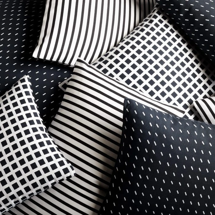 Discover a fan-favorite Unison fabric print with the Stitch Black Throw Pillow Cover. Originally designed in 2010, the idea behind the Stitch pattern was to create an all-over solid print with a subtle texture. Small, hand-drawn dash marks add a sense of movement, making this classic throw pillow cover instantly eye-catching. The durable 100% cotton sailcloth fabric is hand screen-printed in Rhode Island at a family-owned textile mill, which has been in operation for over 80 years. The classic look and feel of the Stitch pattern in a bold black coordinates nicely with our other in-house prints: Sailor and Tiles.