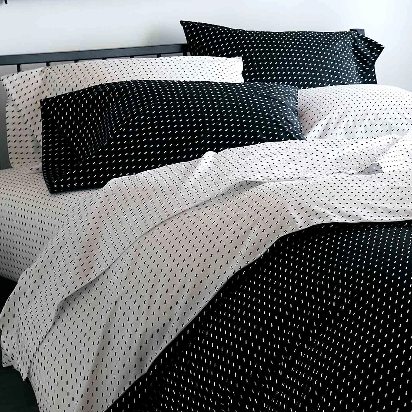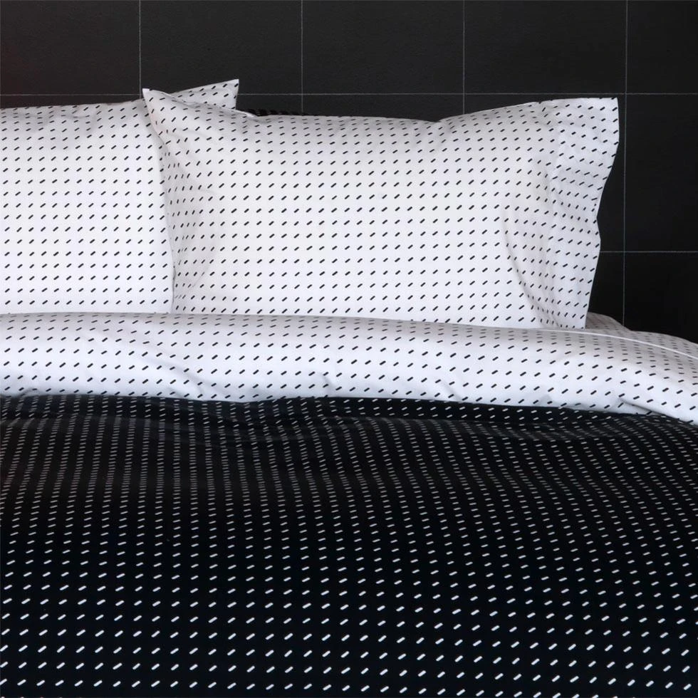 Initially introduced as hand-printed throw pillows over a decade ago, the Stitch pattern went on to be launched as a bedding collection in 2013 and has become a Unison fan-favorite ever since. The black and white pattern is both calming and graphic, acting as an ideal foundation for the rest of your bedding. Made in Portugal from rotary printed, Oeko-Tex® certified 100% cotton percale, you’ll rest easy knowing that these sheets have been responsibly produced and are free from harmful chemicals. Each sheet set includes one flat and one fitted sheet with a continuous elastic hem. Coordinate with our Stitch pillowcases and reversible duvet cover for a bedding set that’s able to adapt to your space and mood.
