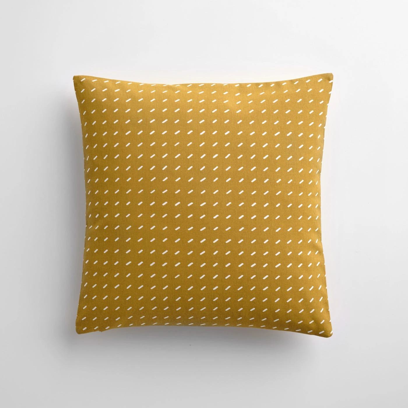 With its deep golden hue, the Stitch Yarrow Throw Pillow Cover makes a beautiful addition to a bed, chair or sofa. This standard-sized square yellow pillow cover features a signature Unison print originally designed in 2010. The hand-drawn dash marks add subtle movement and texture on the 100% cotton sailcloth base. With a thick, substantial feel and excellent durability, this material is perfectly suited to such a timeless pattern. The pillow cover fabric is screen-printed by hand at a family-owned U.S. textile mill in operation since 1937, then finished with hidden zippers by a local Chicago sewing business.