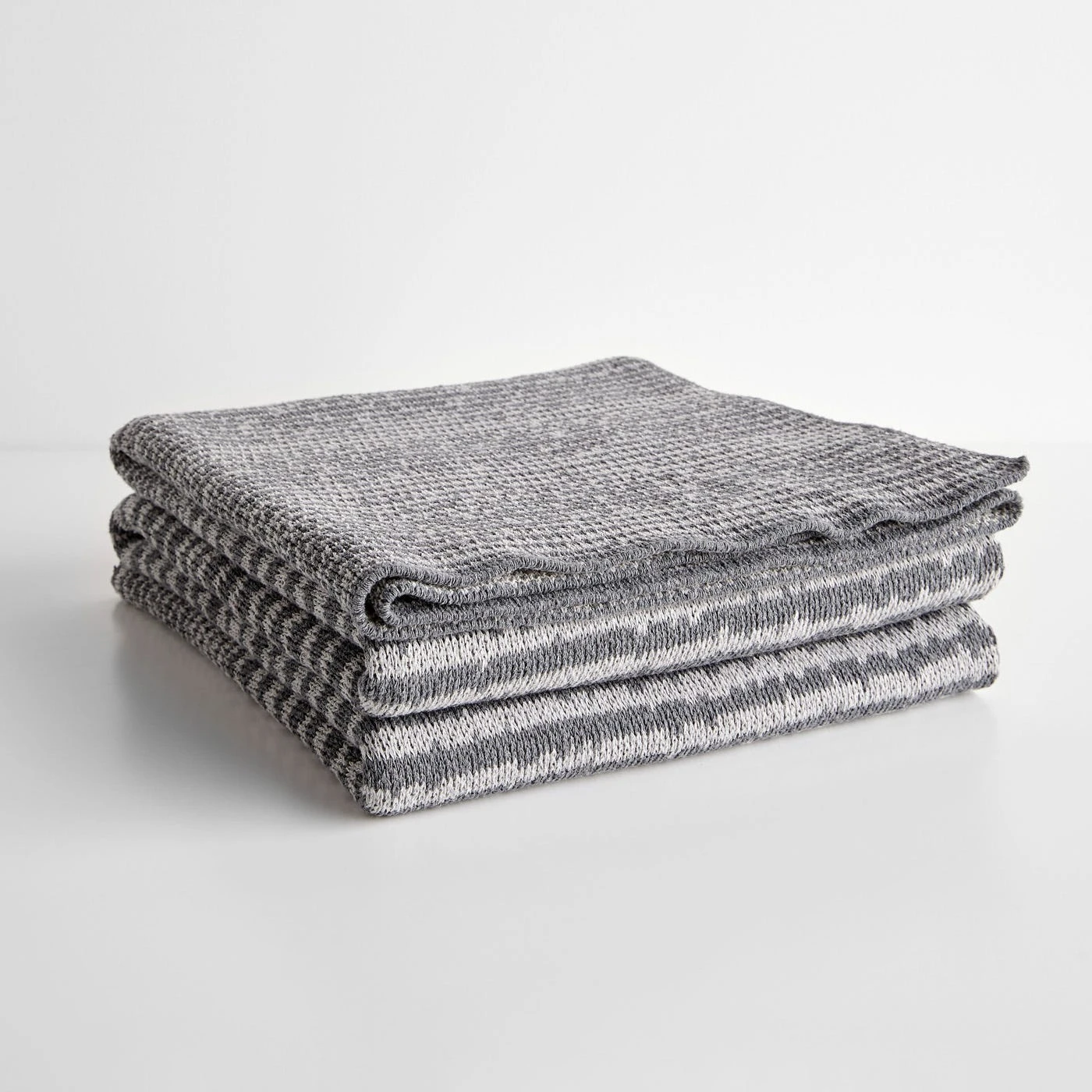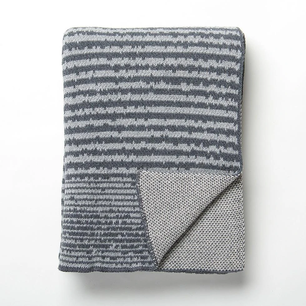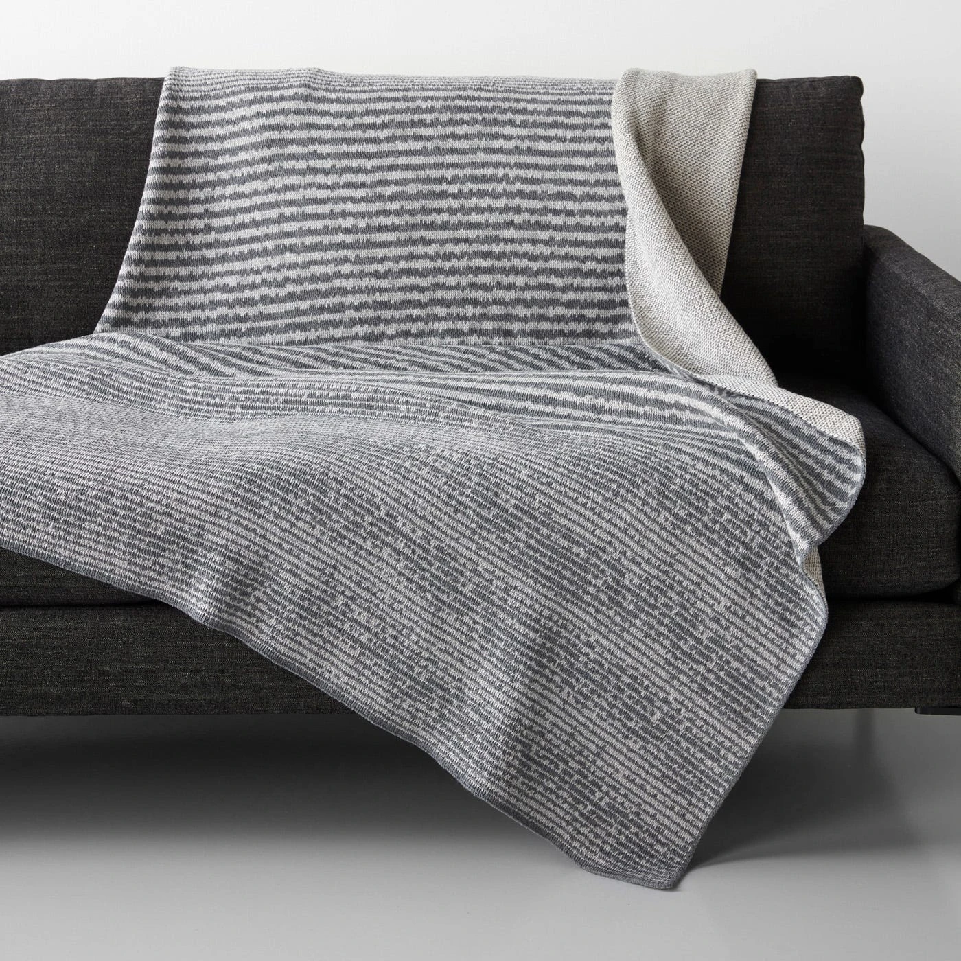 The blanket you throw over the back of a living room chair or sofa is so much more than a blanket. It’s a statement piece – a reflection of both your story and your lifestyle. What does the Strata Knit Blanket say? We think it’s clear as day: “I’m modern, strong, and stylish, but also totally chill.” Two sets of perfectly imperfect stripes offset each other in varied scales and shades of gray, creating a sense of asymmetry on the blanket’s front. Meanwhile, a clean, bird’s eye knit pattern on the reverse side favors the lighter, brighter notes of its recycled cotton and polyester yarns, for a soft-meets-casual mood that’s as laid-back and cool as the person set to curl up in it.