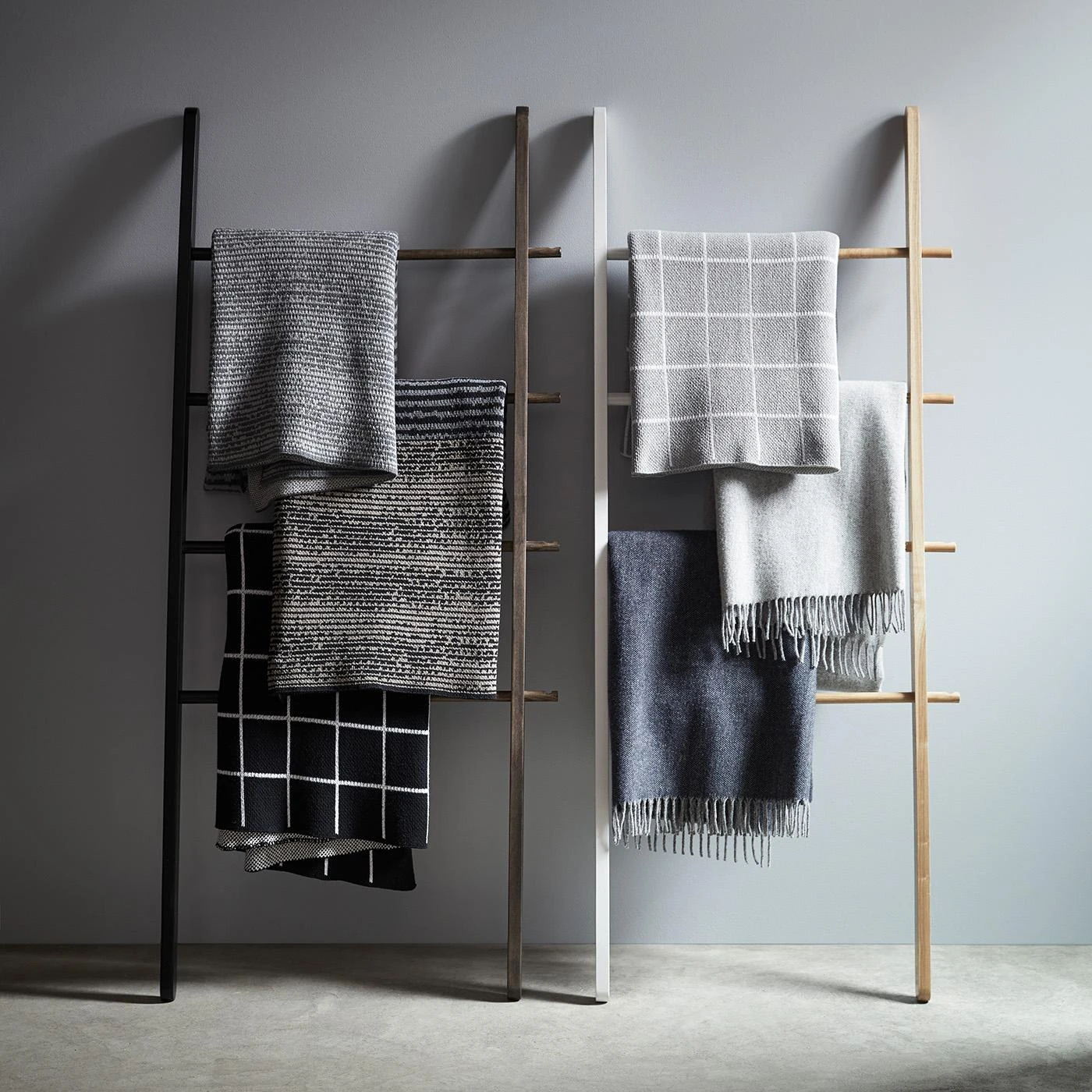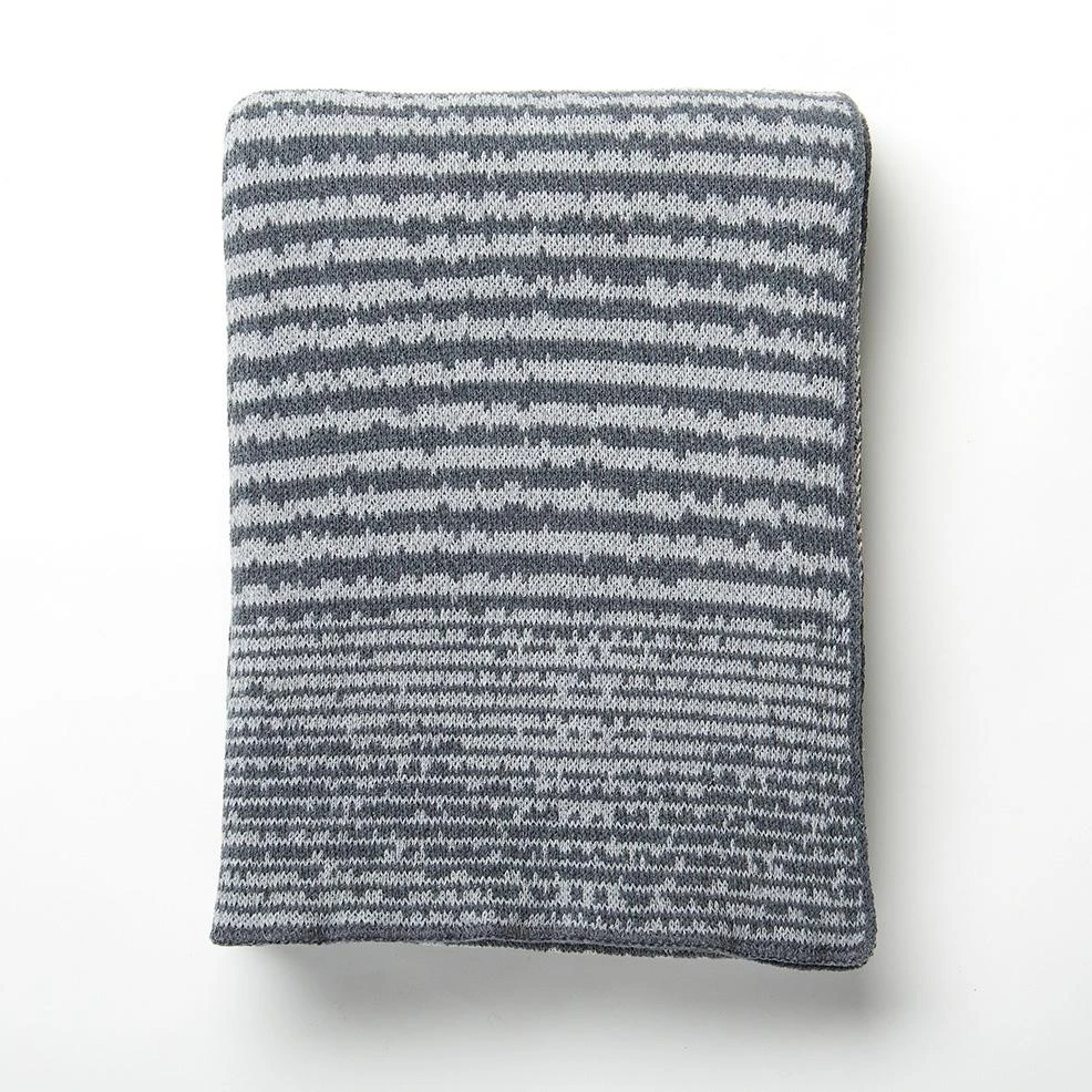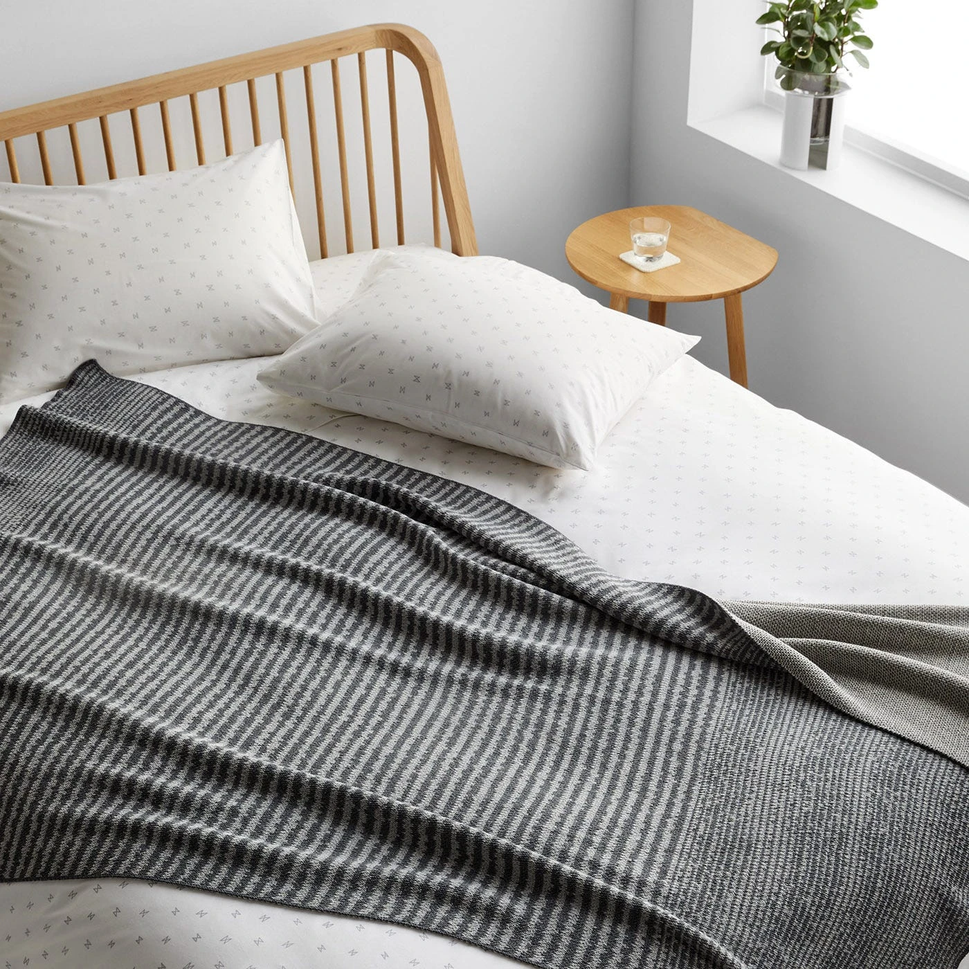 The blanket you throw over the back of a living room chair or sofa is so much more than a blanket. It’s a statement piece – a reflection of both your story and your lifestyle. What does the Strata Knit Blanket say? We think it’s clear as day: “I’m modern, strong, and stylish, but also totally chill.” Two sets of perfectly imperfect stripes offset each other in varied scales and shades of gray, creating a sense of asymmetry on the blanket’s front. Meanwhile, a clean, bird’s eye knit pattern on the reverse side favors the lighter, brighter notes of its recycled cotton and polyester yarns, for a soft-meets-casual mood that’s as laid-back and cool as the person set to curl up in it.