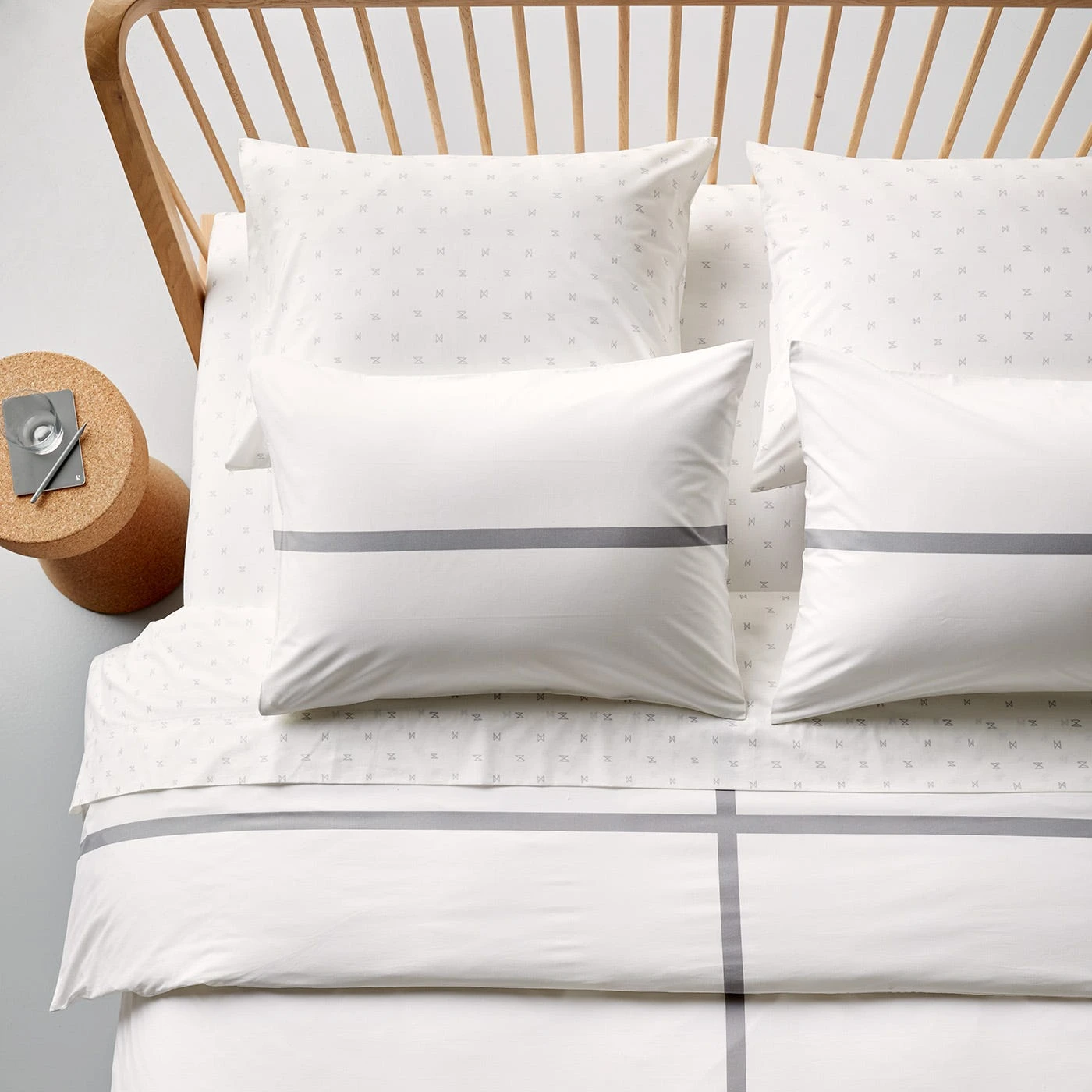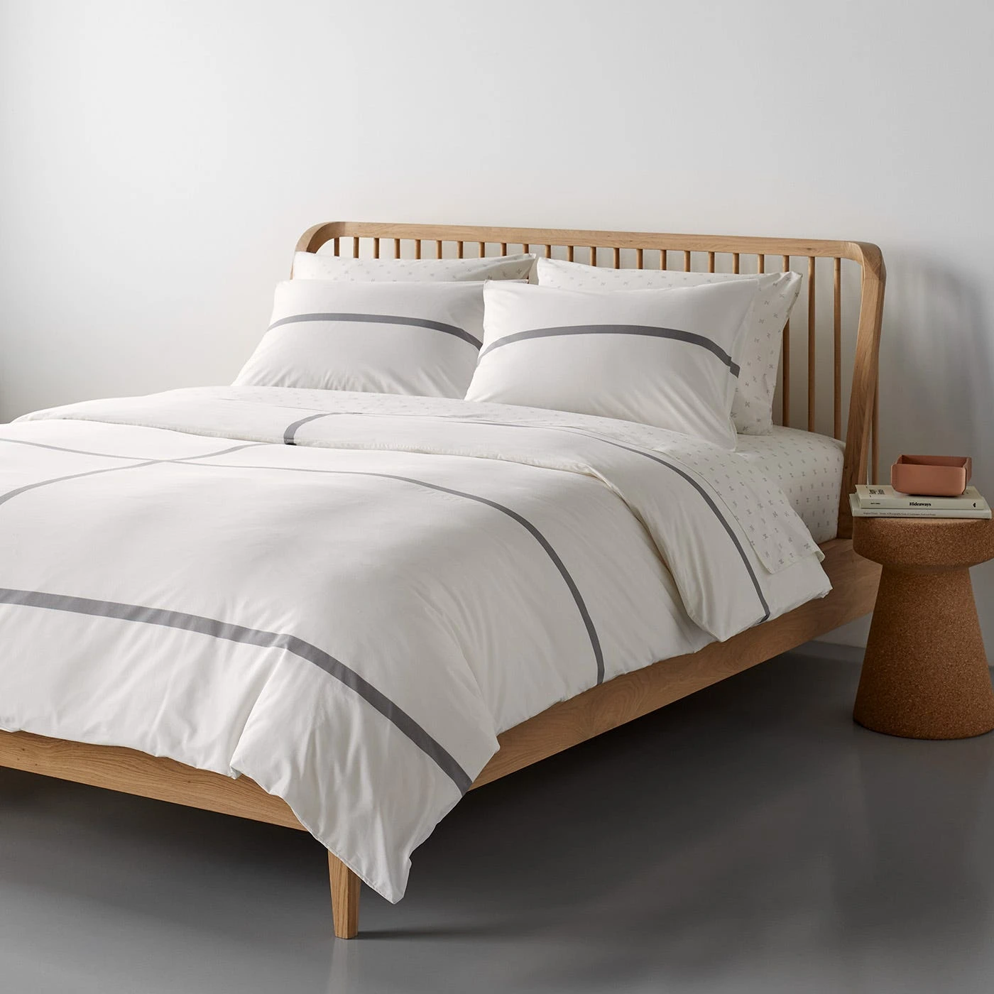 Put your mind at rest with this meditative duvet cover. The strong but peaceful architectural simplicity of the Tatami print is inspired by rice straw matting used to cover floors in traditional Japanese houses. With clean grid lines and natural colors, you can tidy your room just by making your bed. Enjoy this sophisticated, minimal style in clean white with a neutral gray grid.