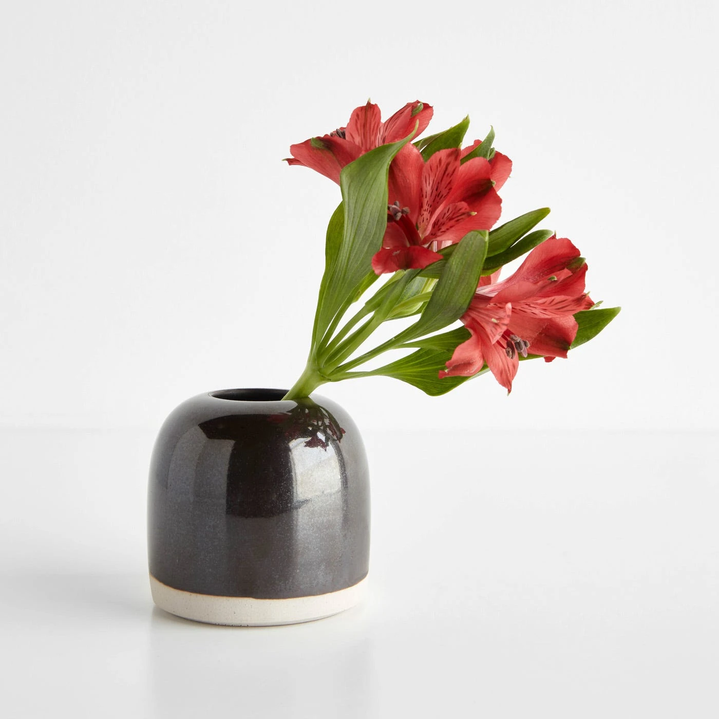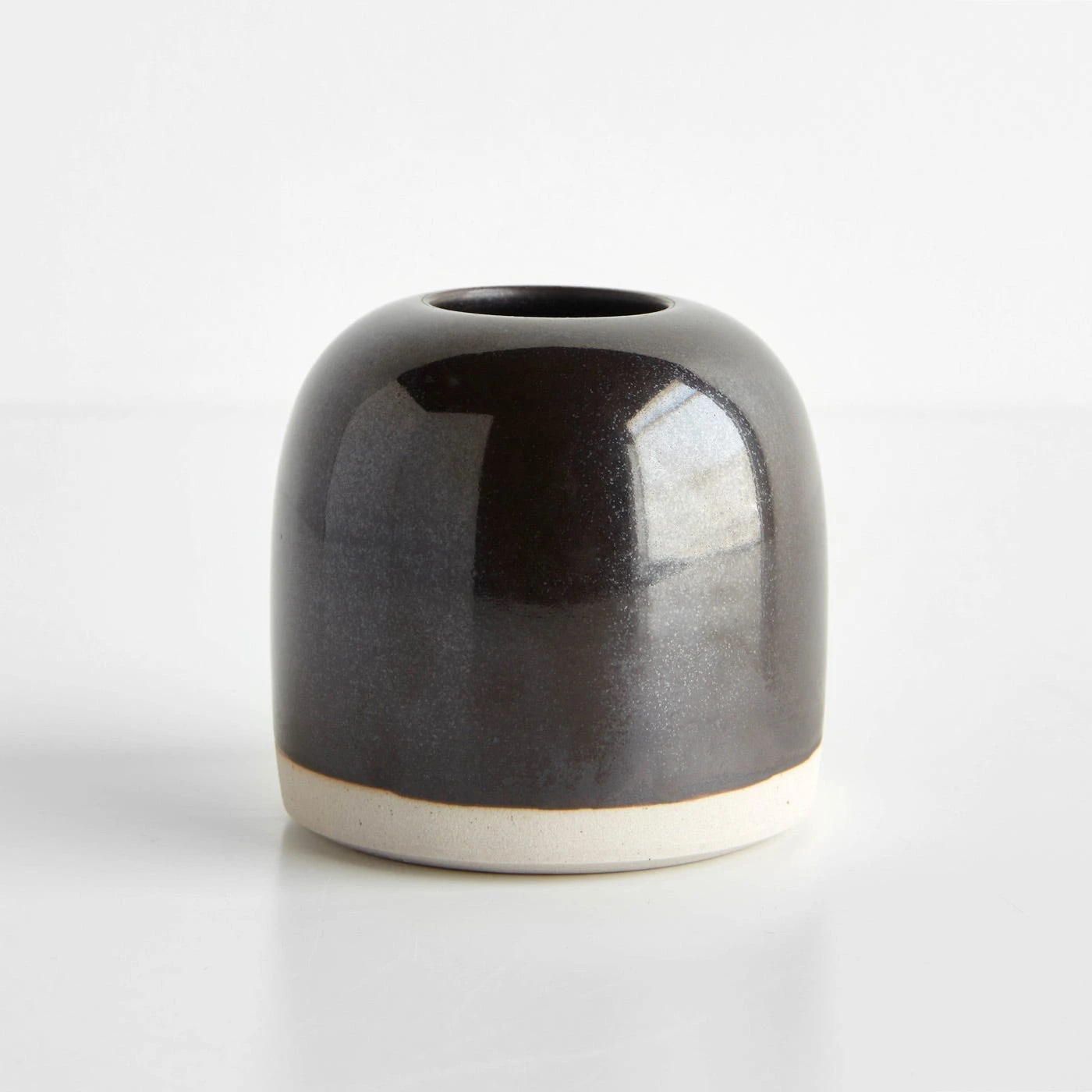 Handcrafted beauty is matched up with nature-inspired color in the Thrown Black Bud Vase. This delightful table accent may be small in size, but it adds an eye-catching, artistic element to a table, shelf or mantel. Crafted in a small Southern California studio run by Japanese artist Nobuhito Nishigawara, each piece features a rounded top and straight sides with a slight taper to the flat bottom. An eye-catching, iridescent black glaze covers most of the piece, leaving an exposed portion of raw natural matte clay. This one-of-a-kind handmade vase is ideal for everyday use and makes for a unique, beautiful gift.