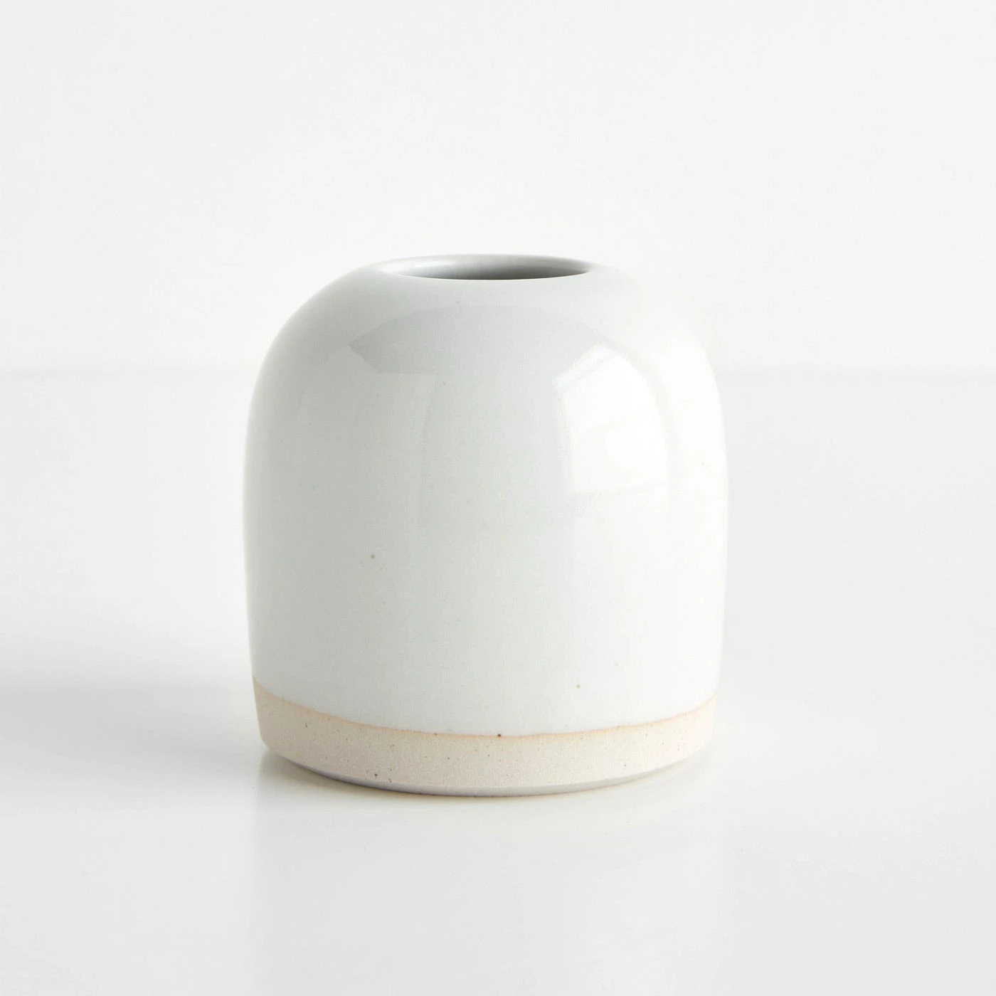 Handcrafted beauty is matched up with nature-inspired color in the Thrown White Bud Vase. This delightful table accent may be small in size, but it adds an eye-catching, artistic element to a table, shelf or mantel. Crafted in a small Southern California studio run by Japanese artist Nobuhito Nishigawara, each piece features a rounded top and straight sides with a slight taper to the flat bottom. A glossy white glaze covers most of the piece, leaving an exposed portion of raw natural matte clay. This one-of-a-kind handmade vase is ideal for everyday use and makes for a unique, beautiful gift.